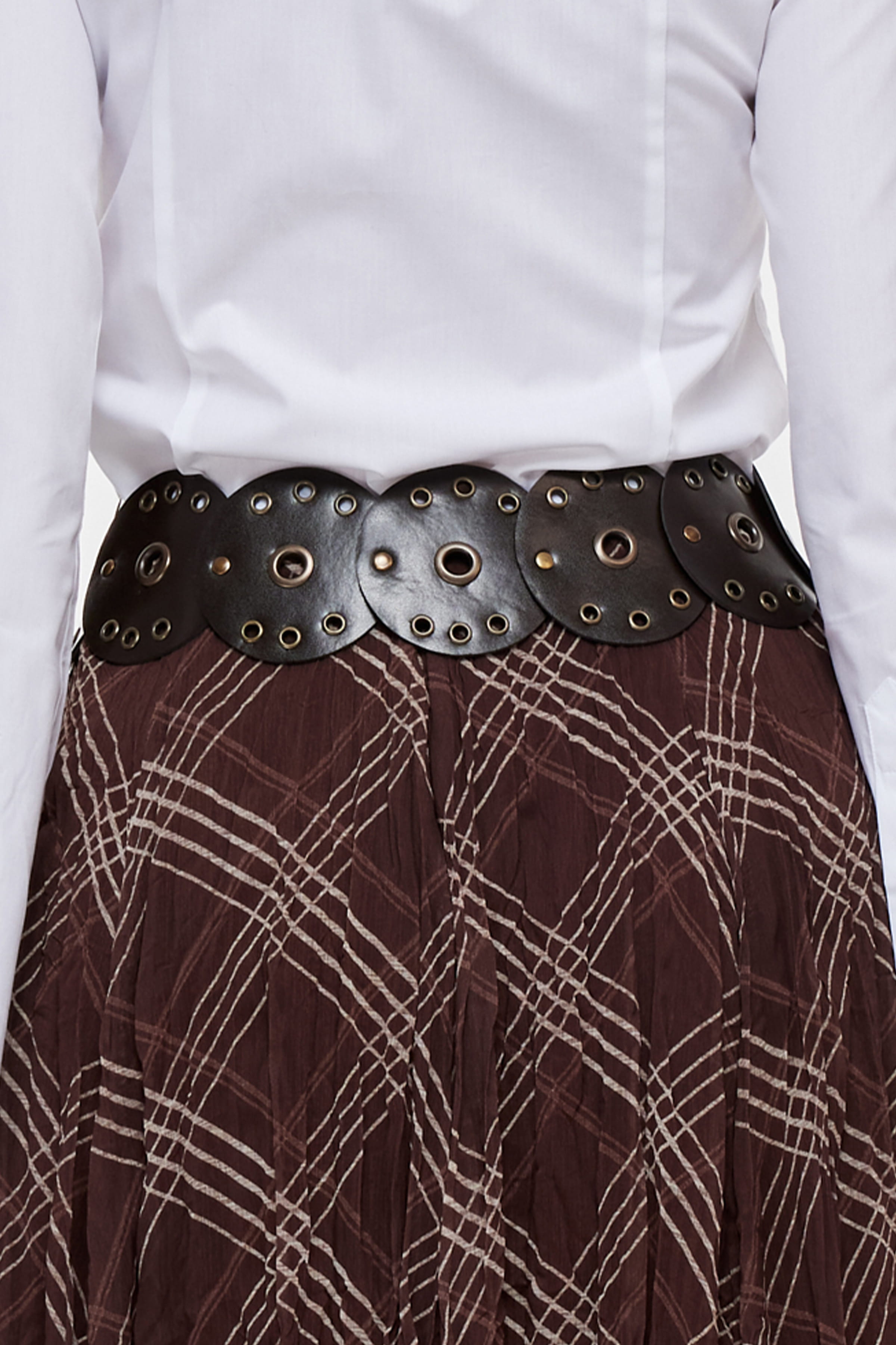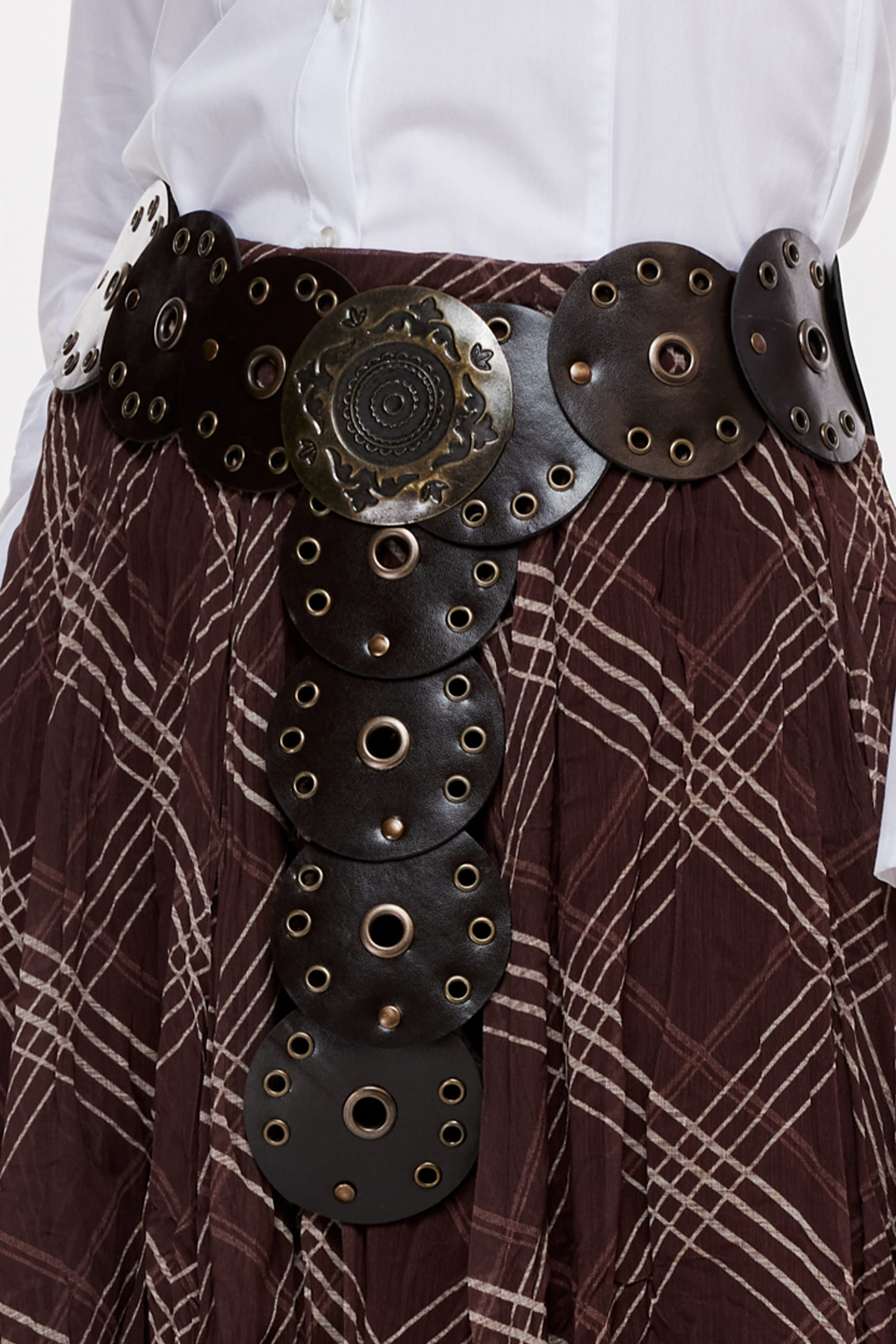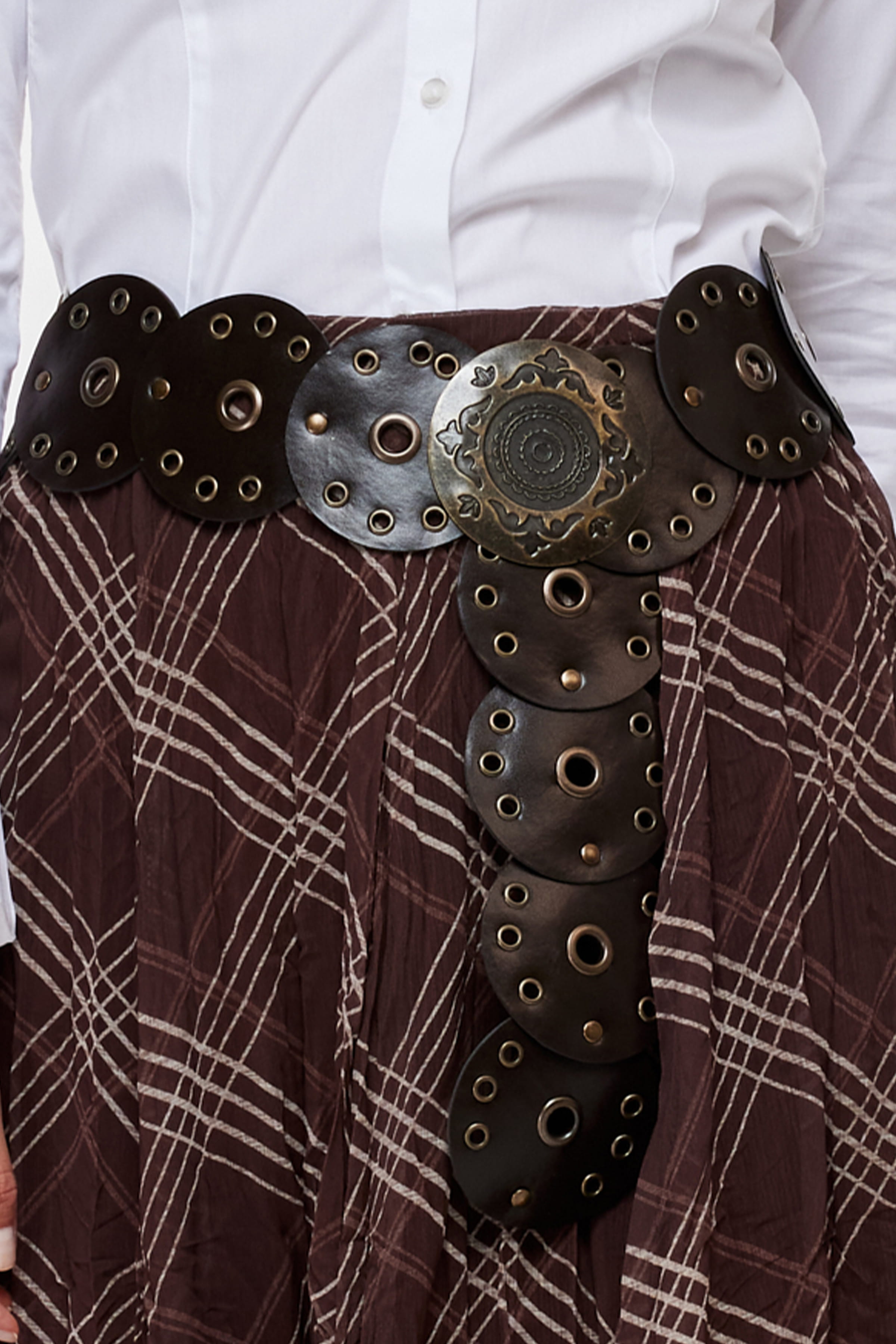 Geniş, suni deri görünümlü halka parçalardan oluşan kemer. Kuşgözü ve metalik detaylı.