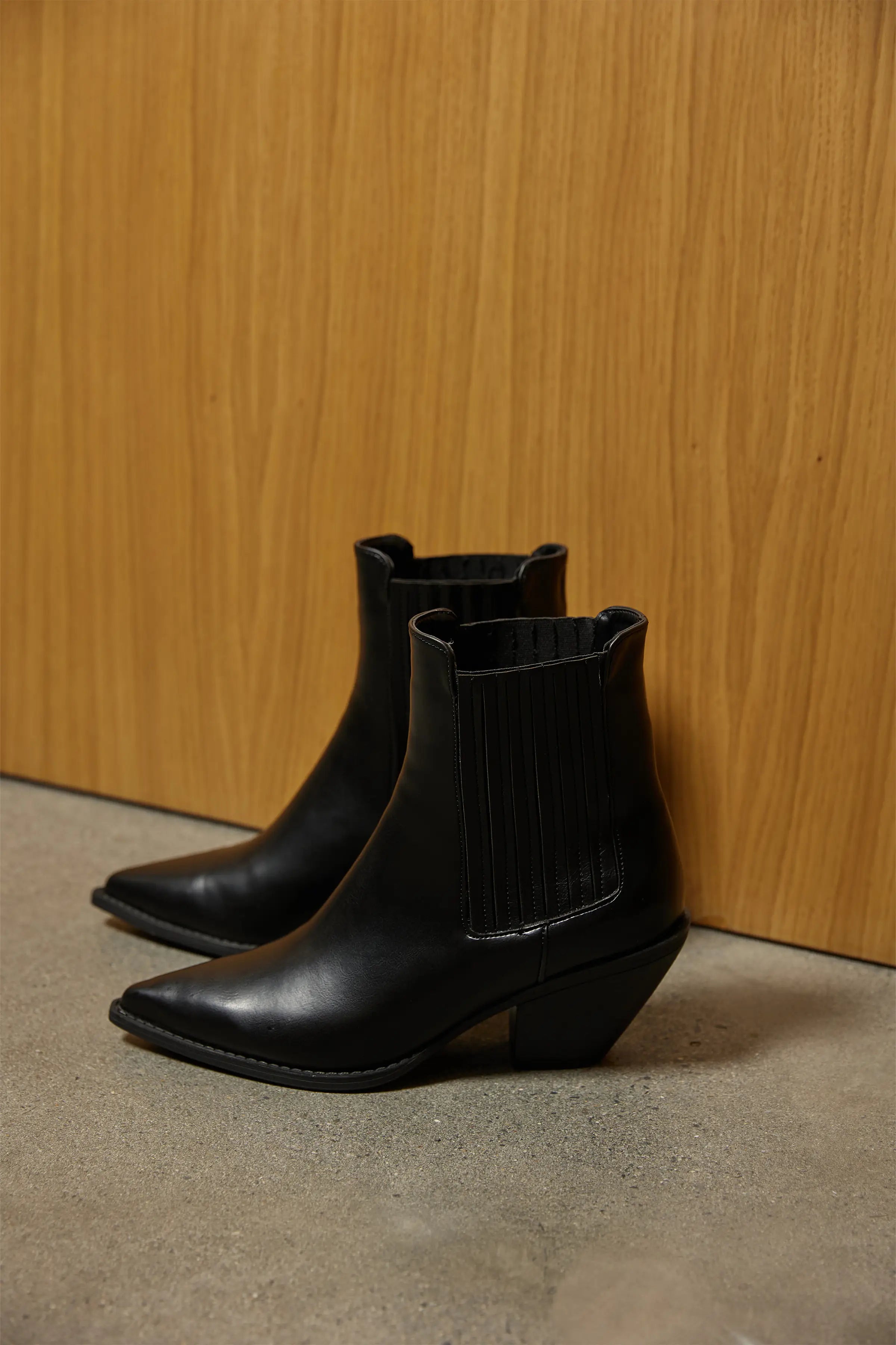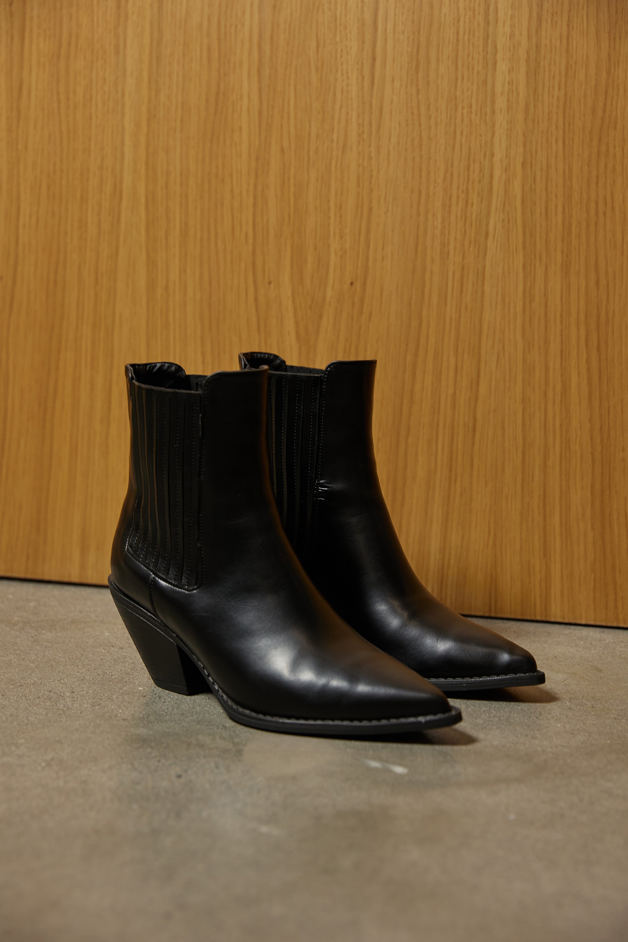 Siyah western tarzı bilekte bot. Sivri burunlu ve açılı kalın topuklu. Yanlarda kolay giyim sağlayan lastik detayı bulunur. Topuk: 7 cm.