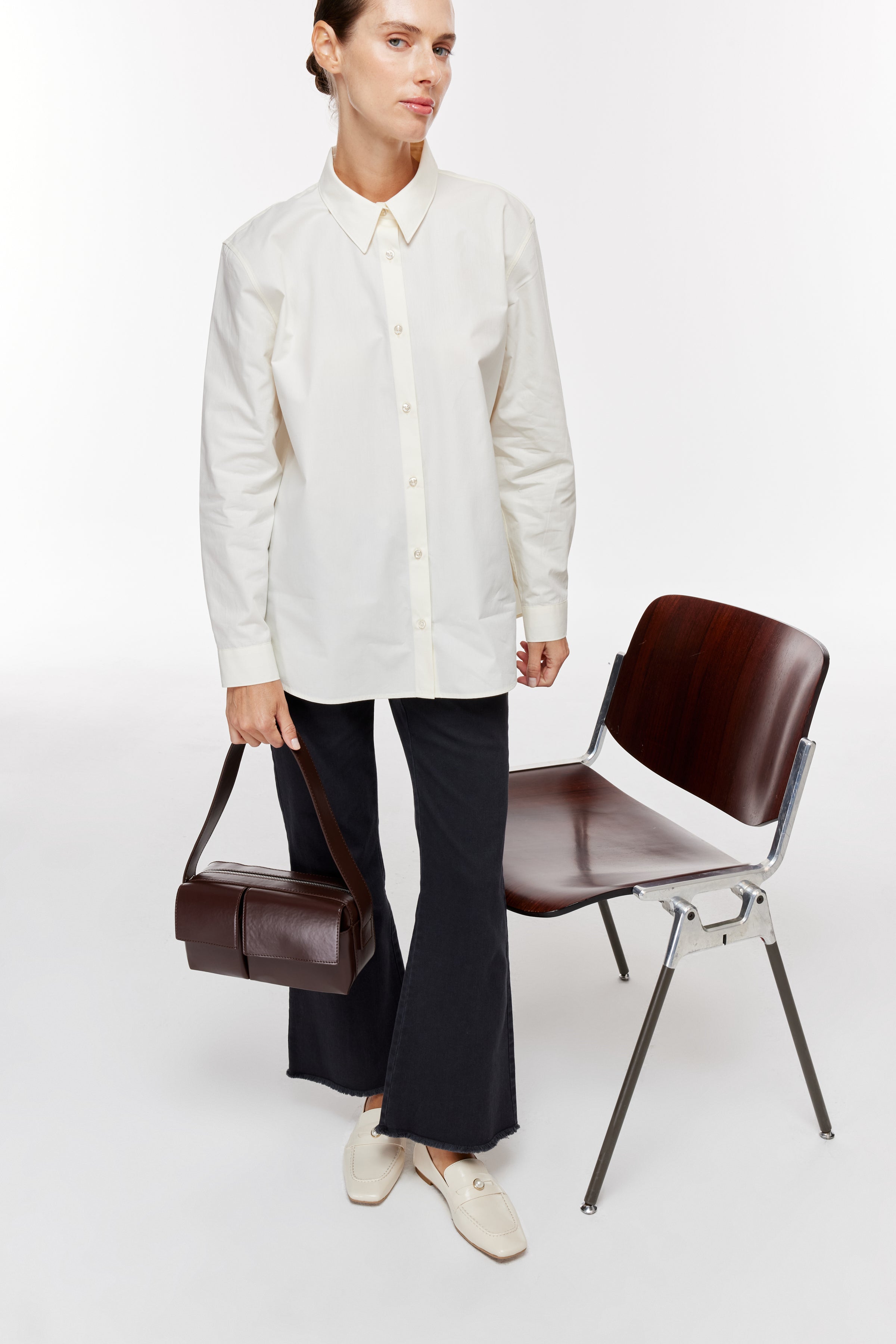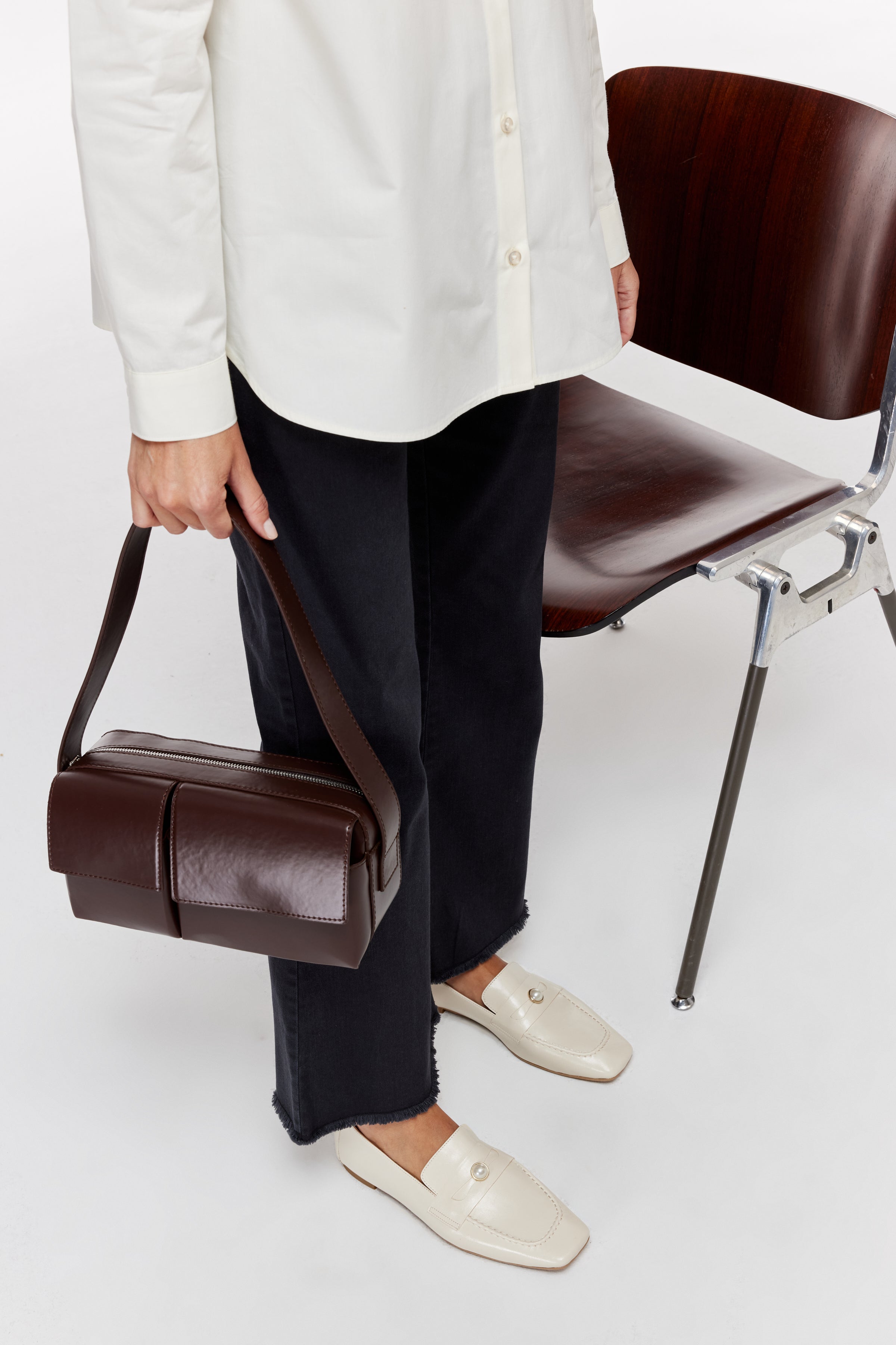 Bej renkte Kare burunlu vegan deri babet. Bant üzerinde inci detayı bulunur.