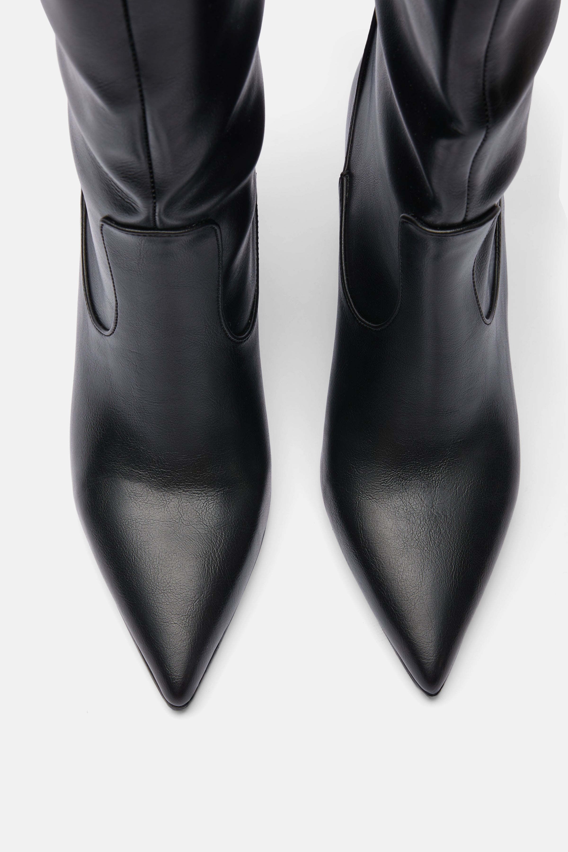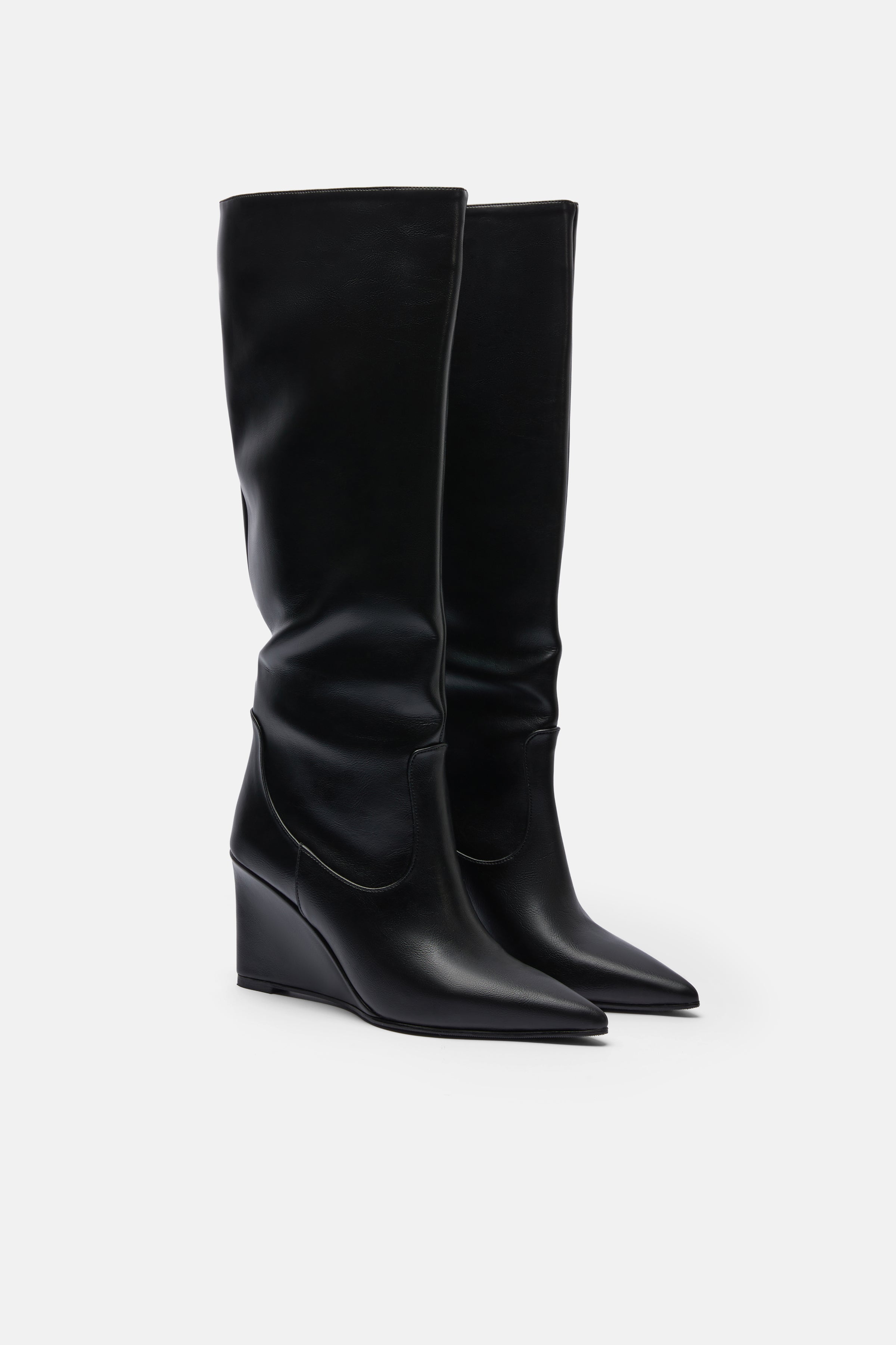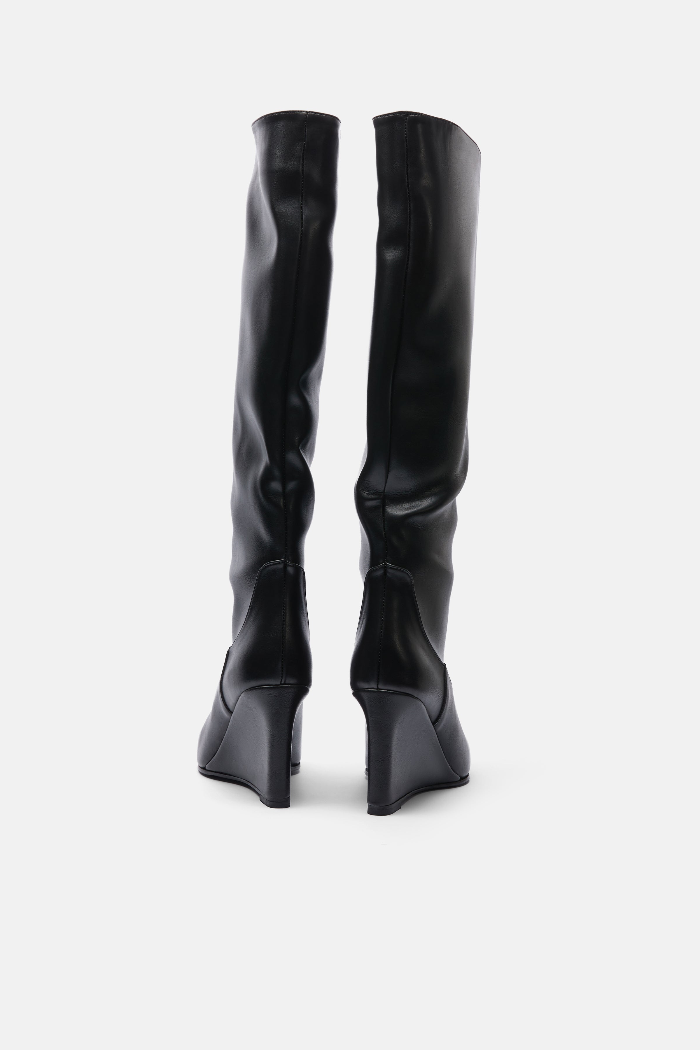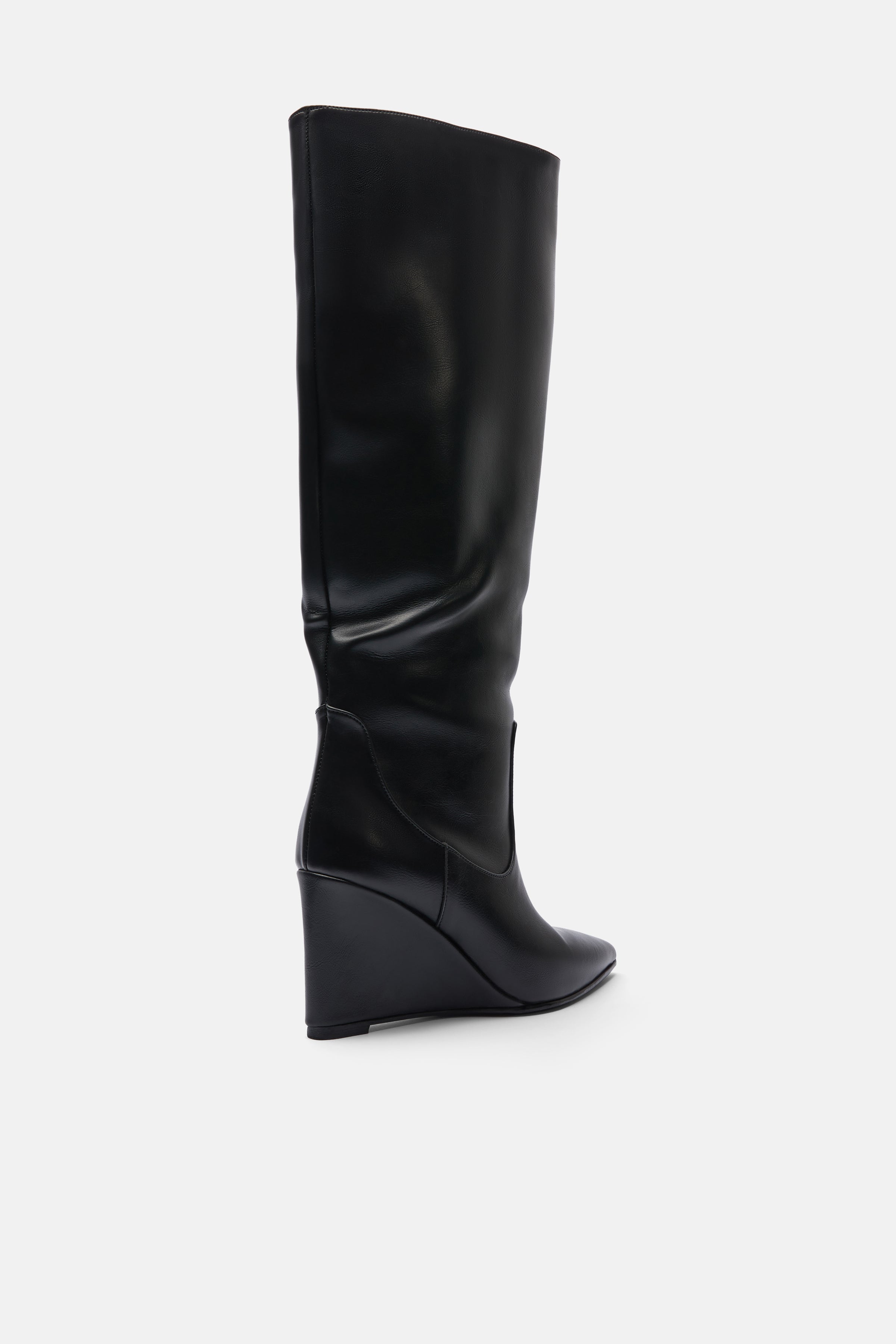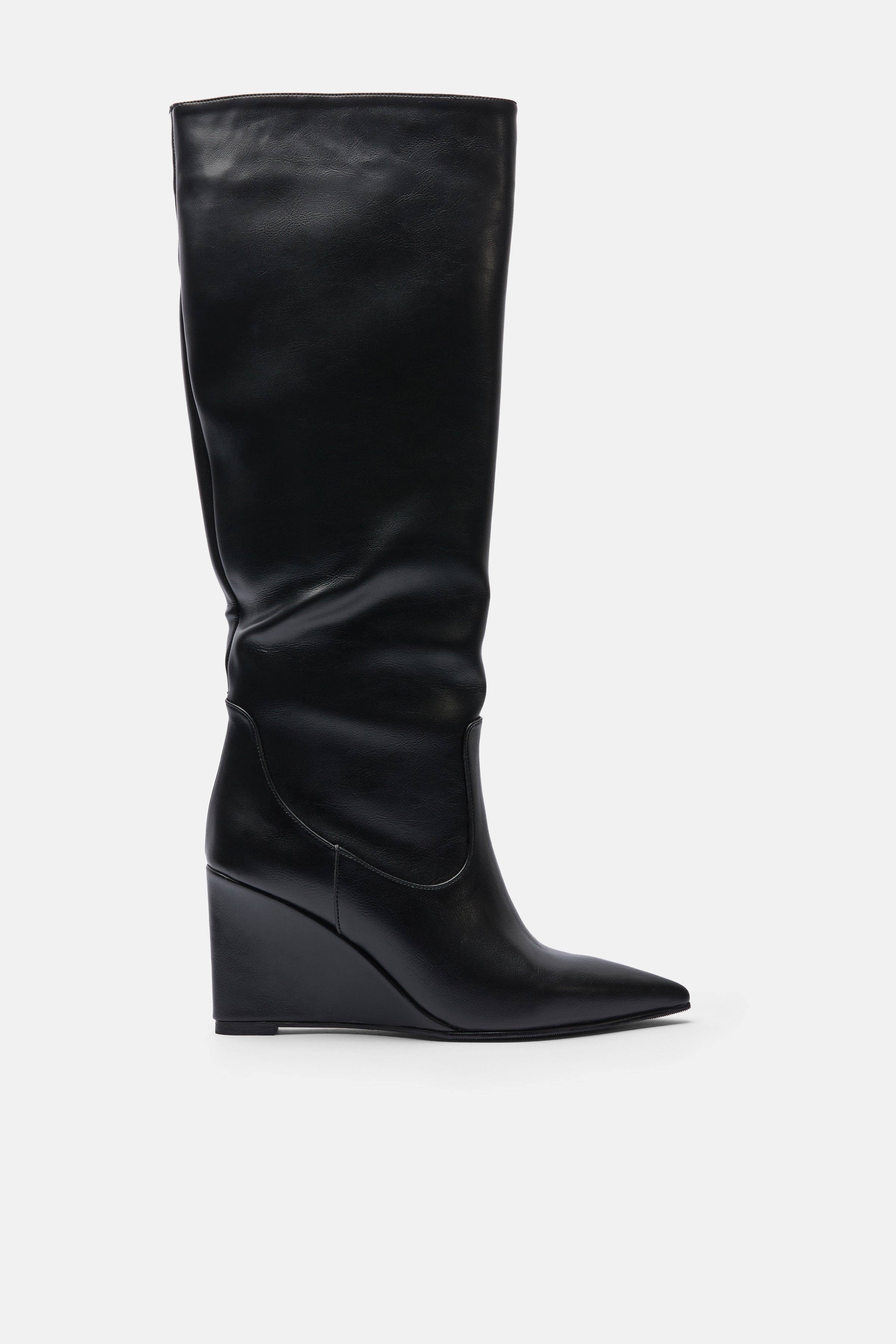 Siyah renkte, dolgu topuklu uzun çizme. Sivri burunlu. Geniş ve dökümlü konç tasarımına sahiptir.