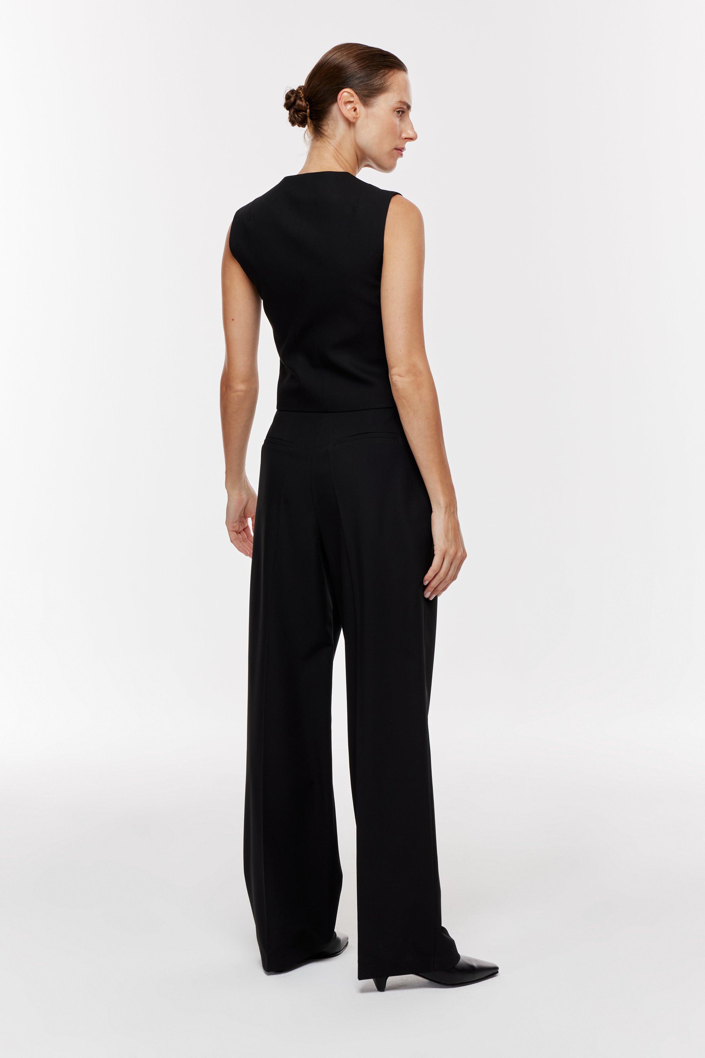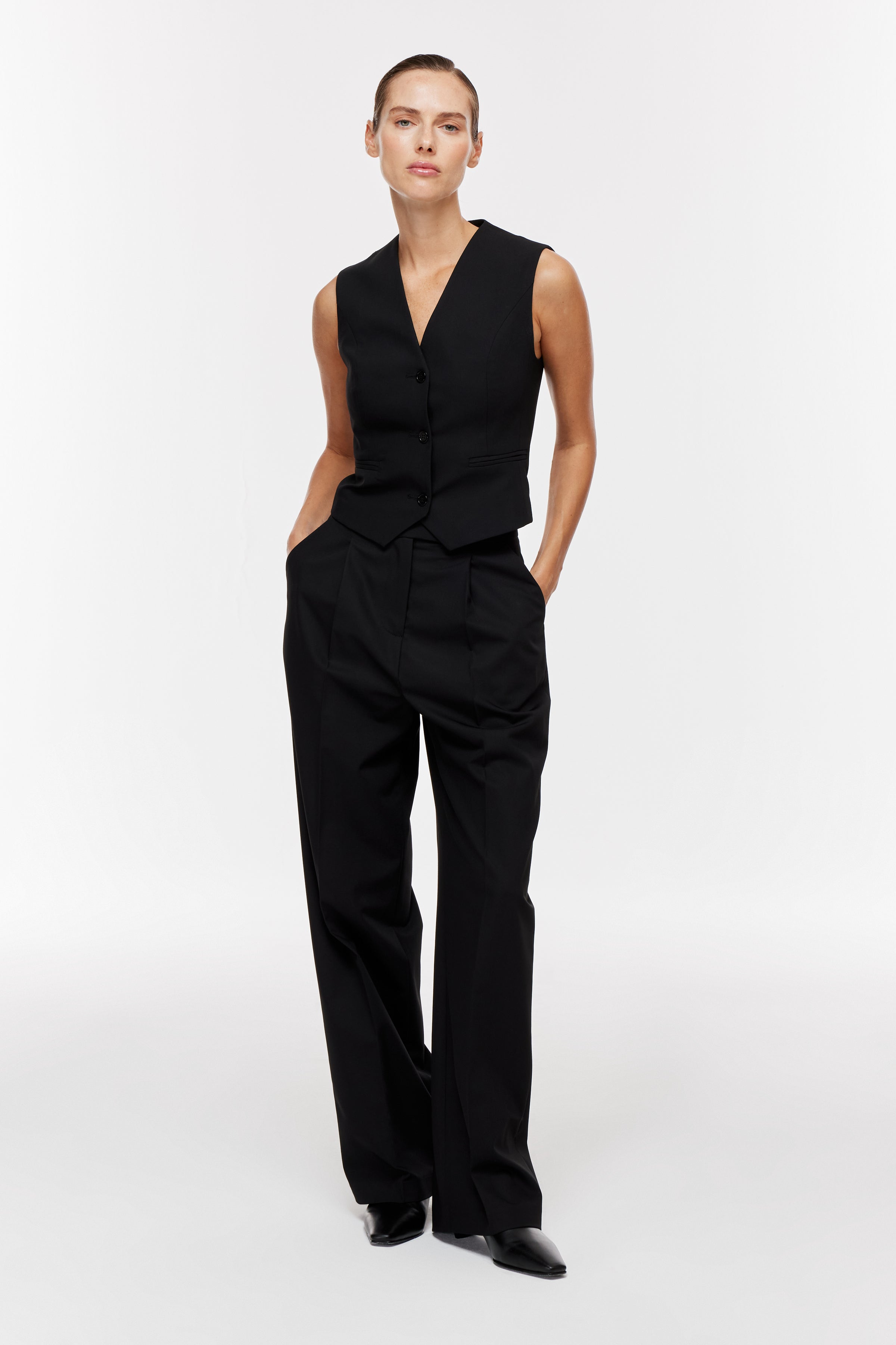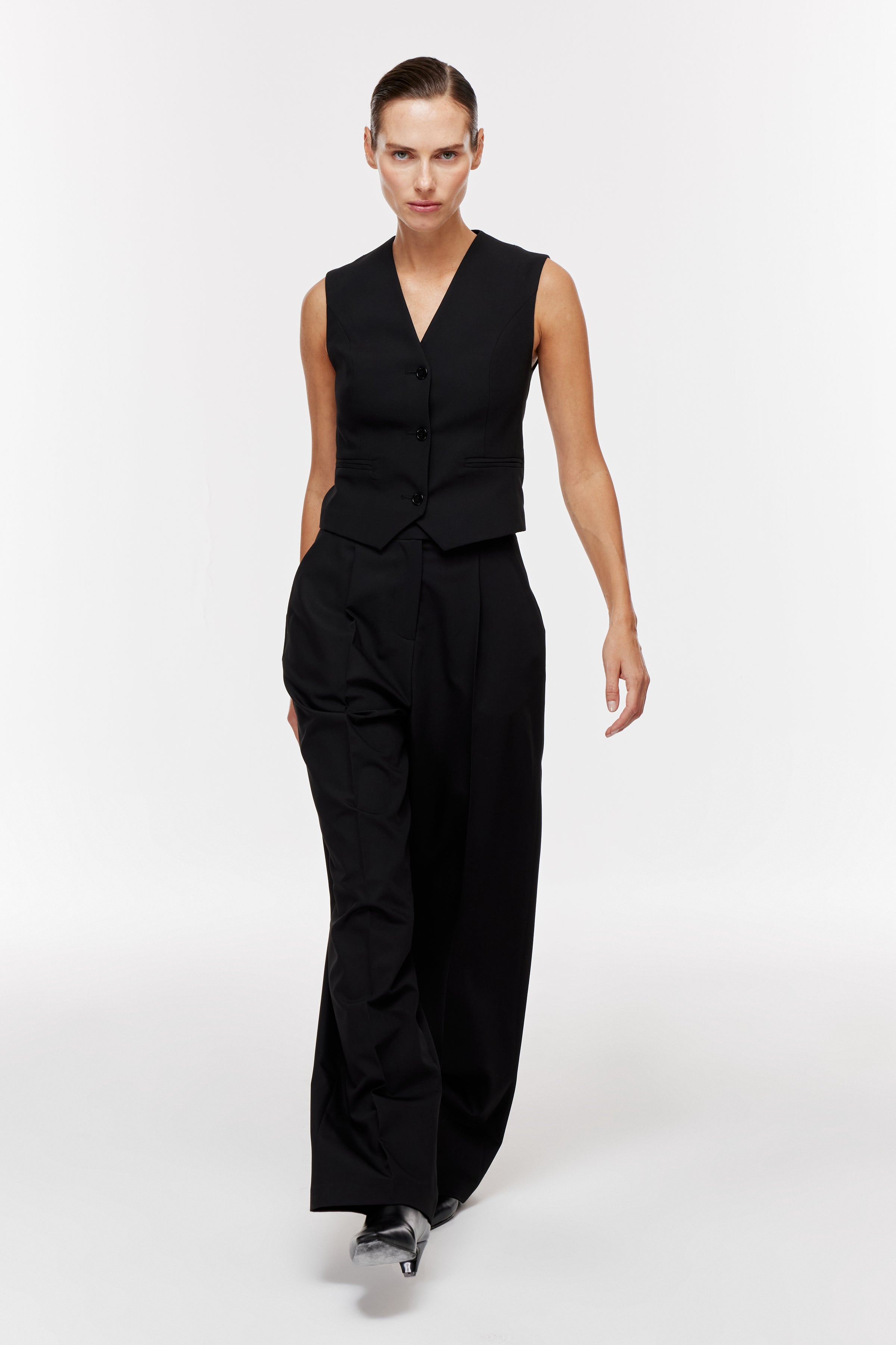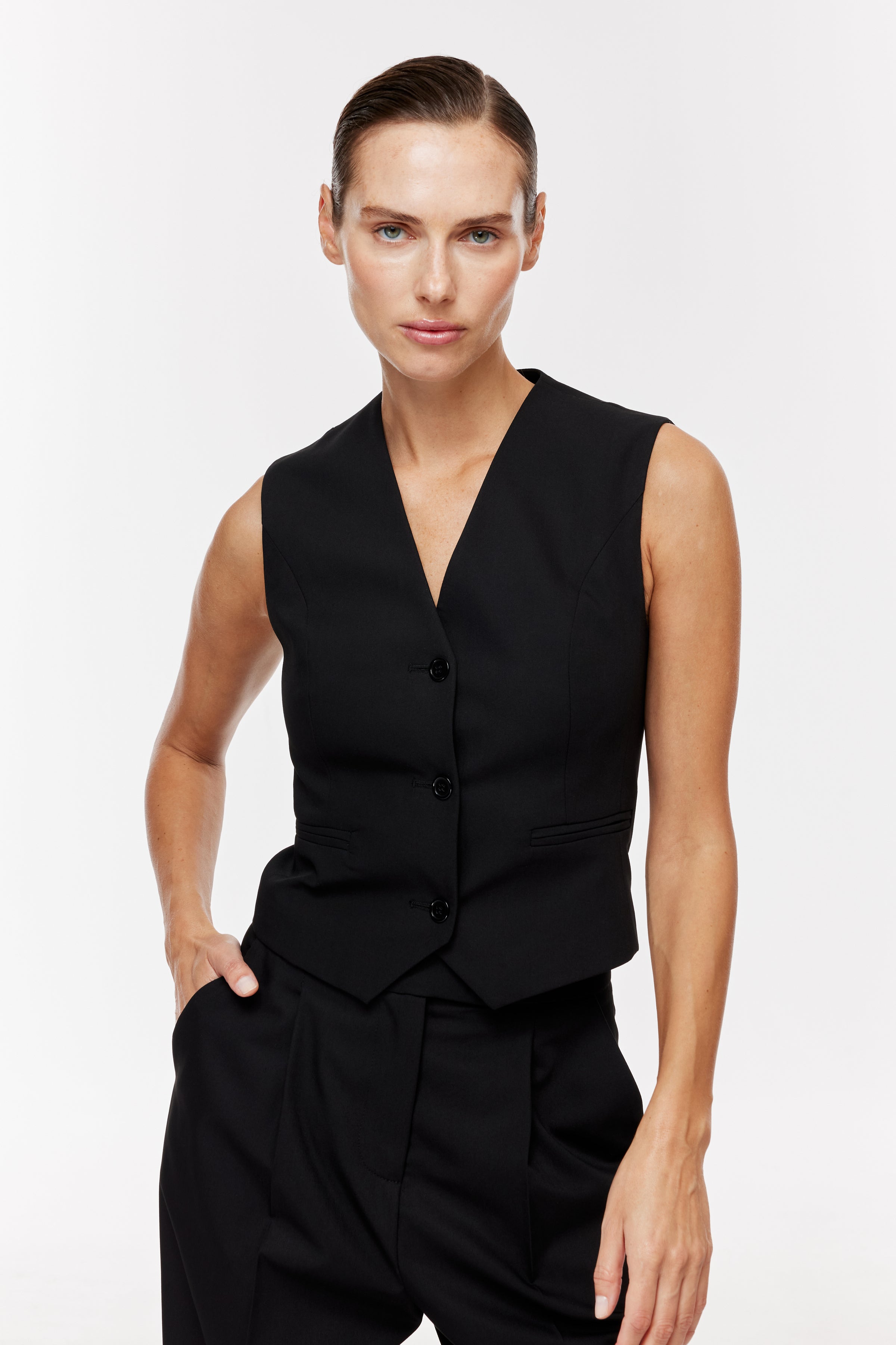 V yaka, kolsuz yelek. Önü fleto cep görünümlü, düğme iliklemeli.
