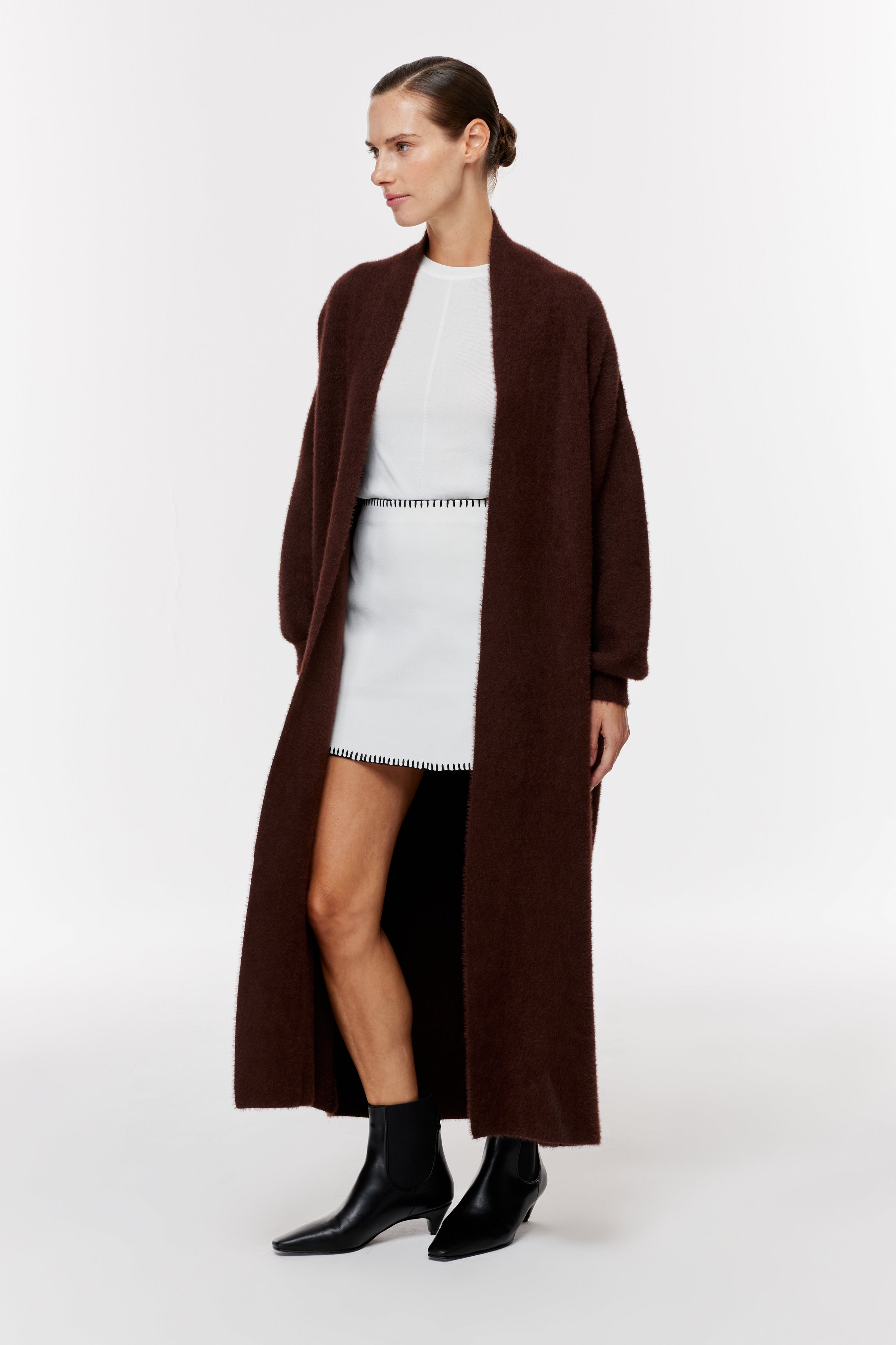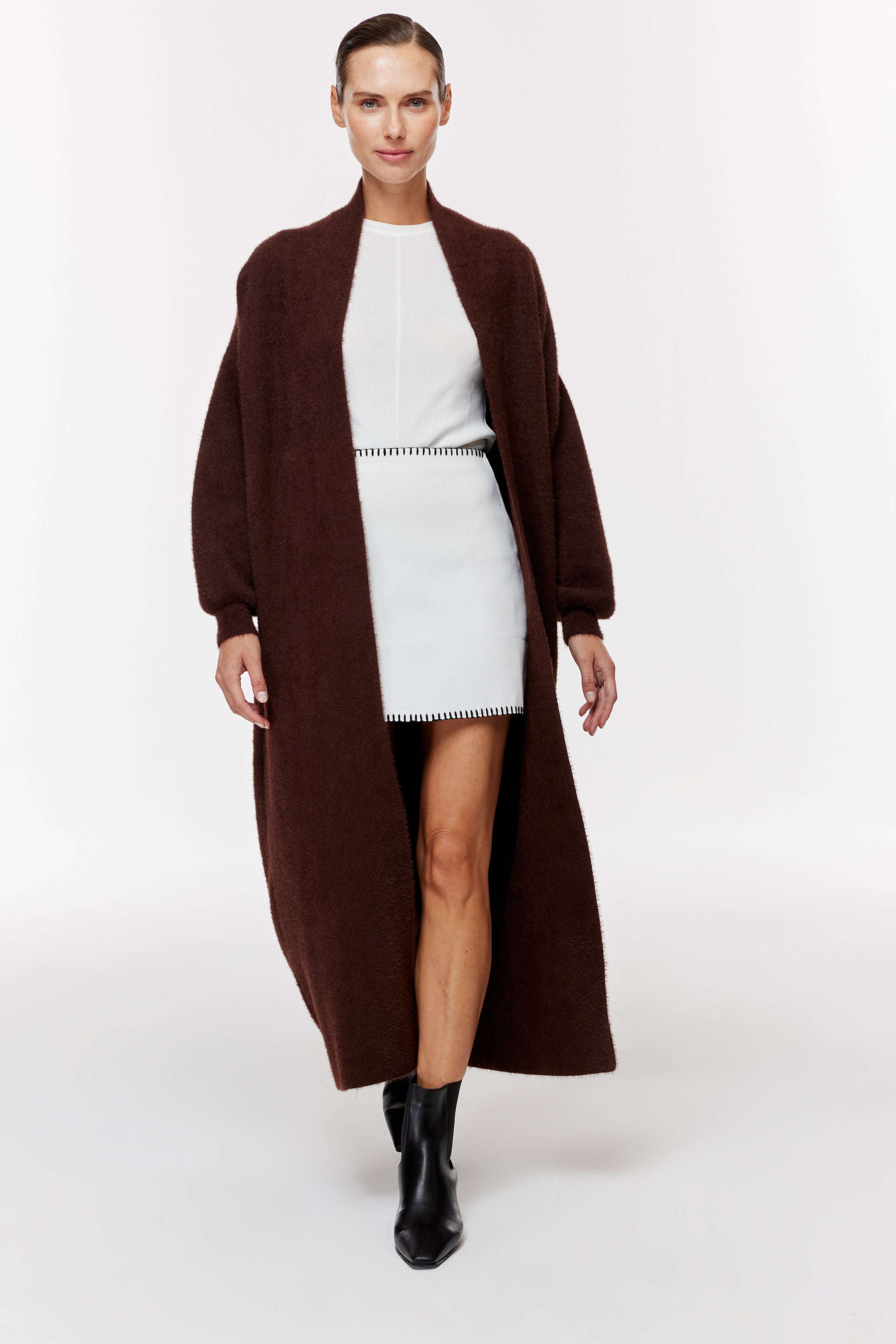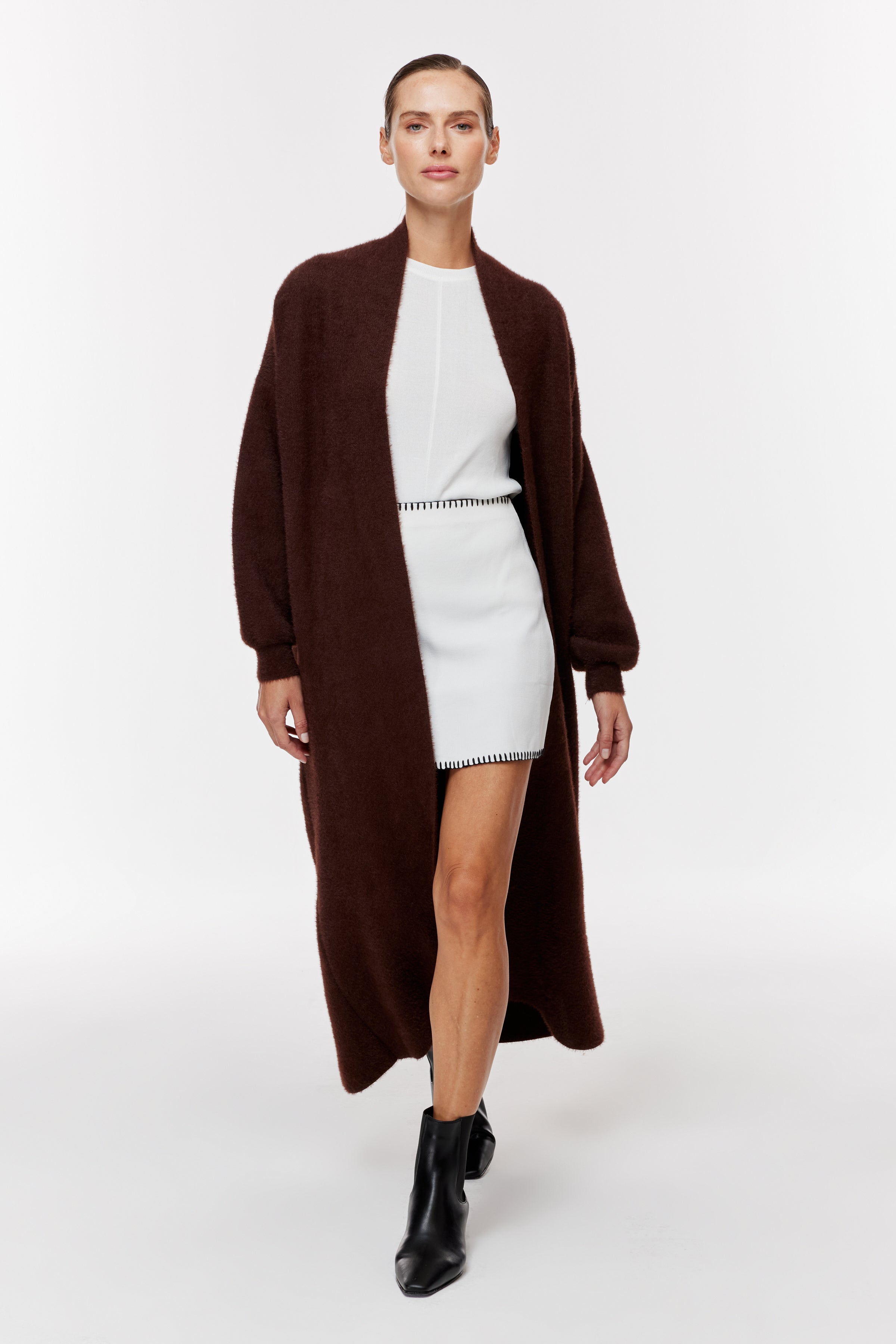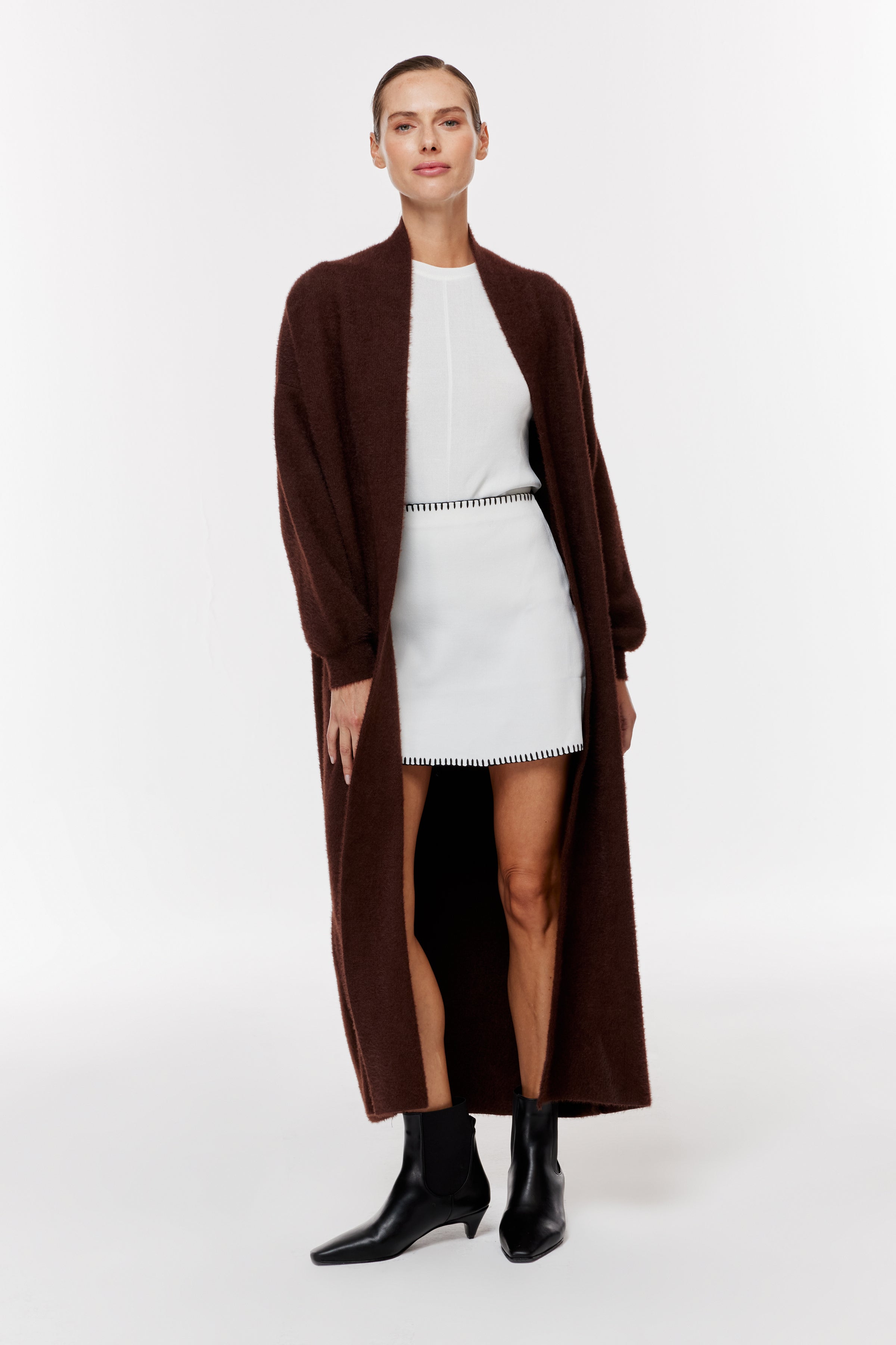 Yakası katlı, düşük omuzlu ve uzun kollu, rahat kesim hırka. Oversize kalıp.