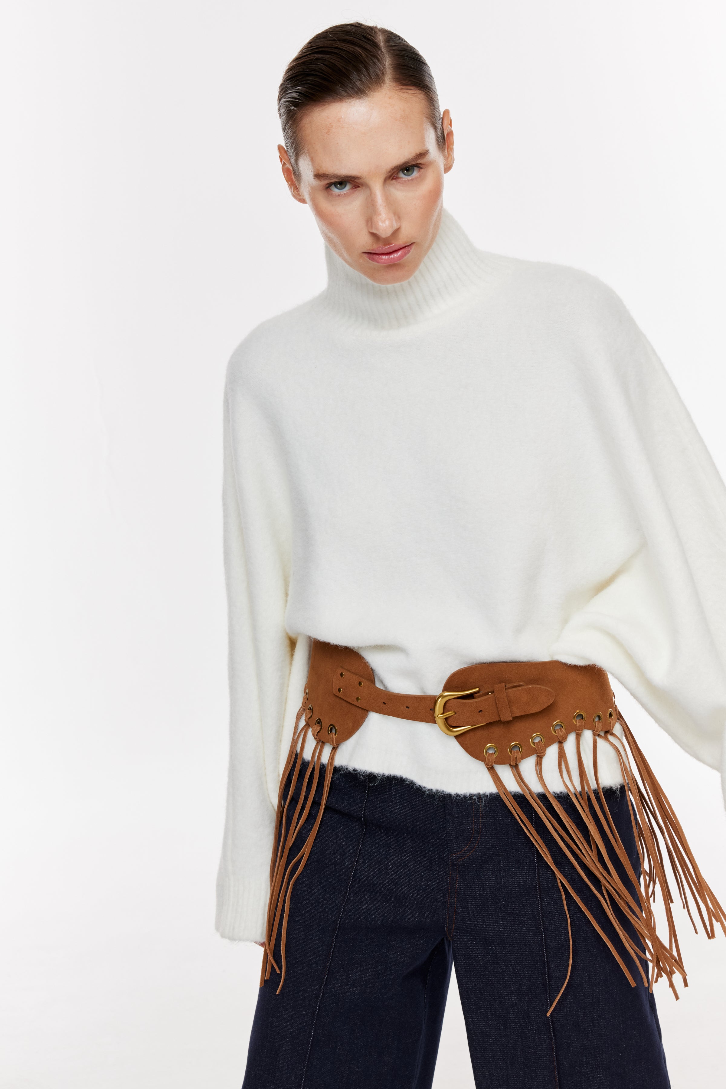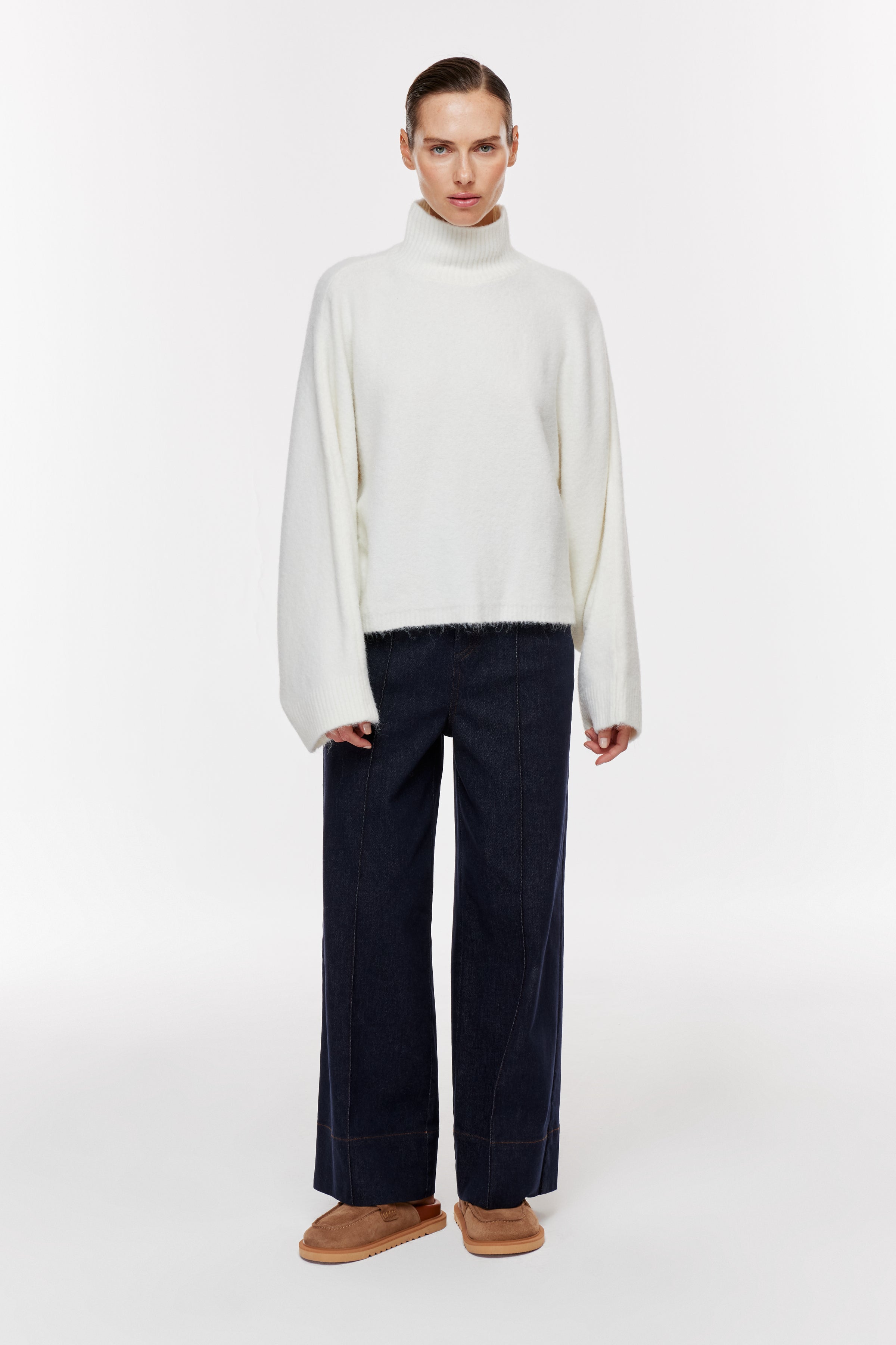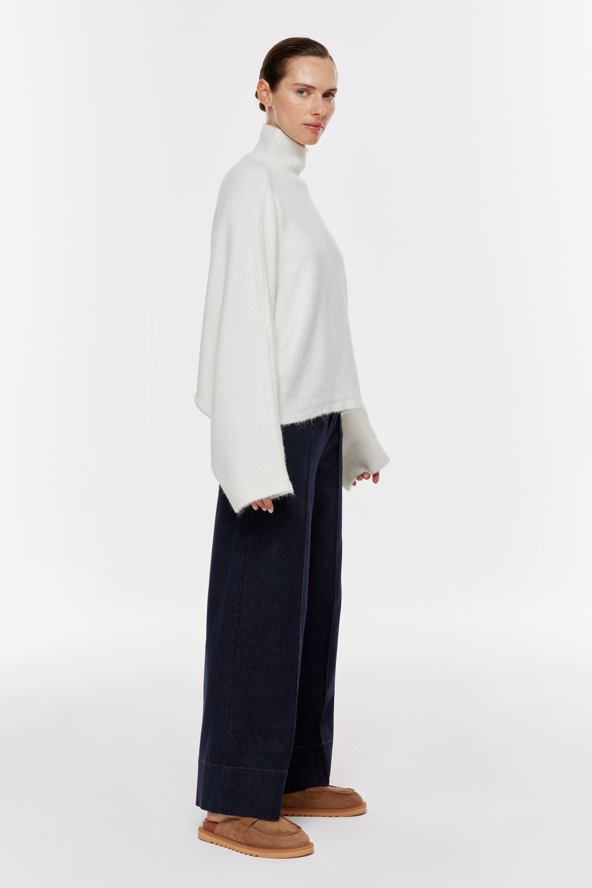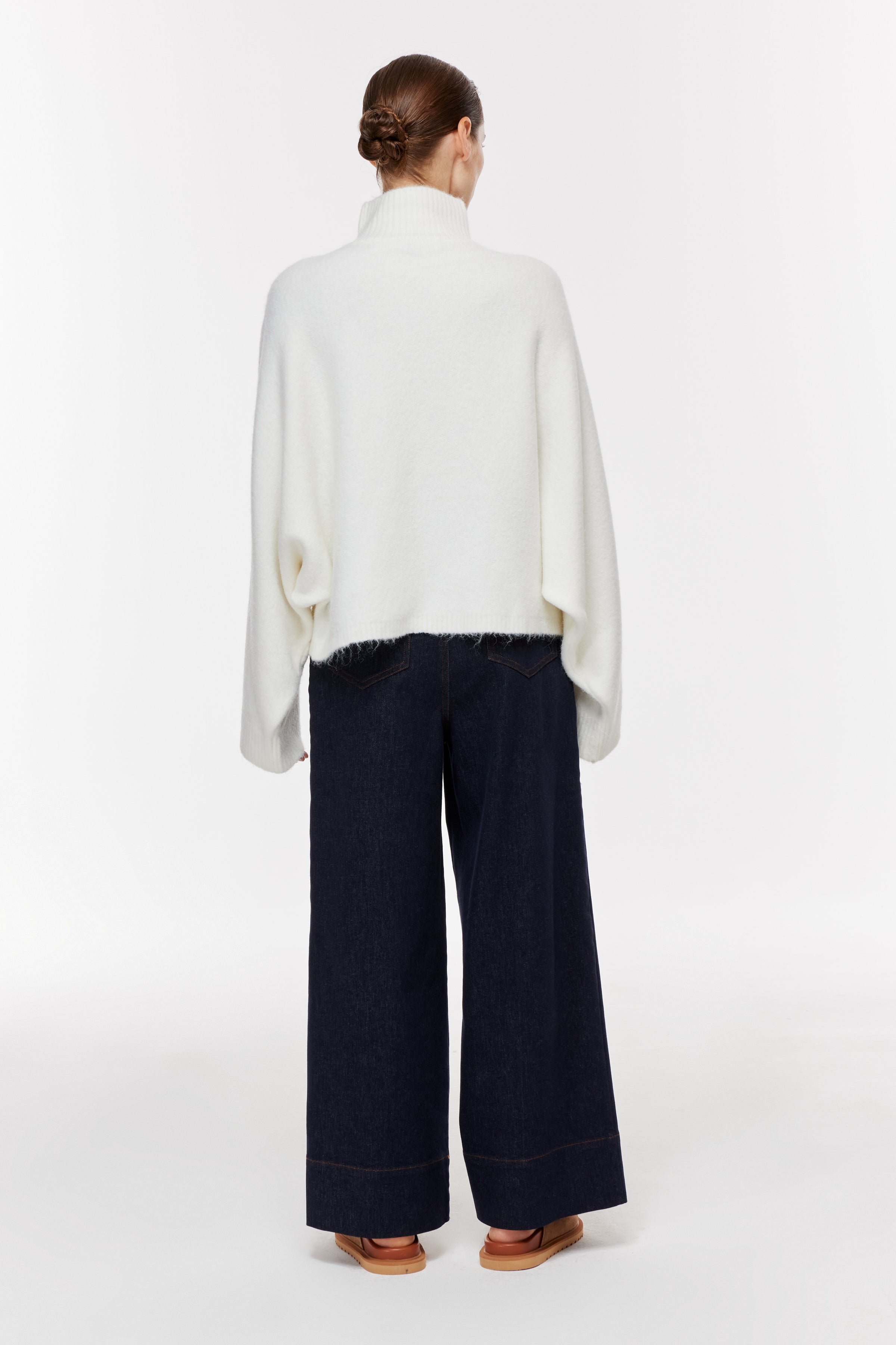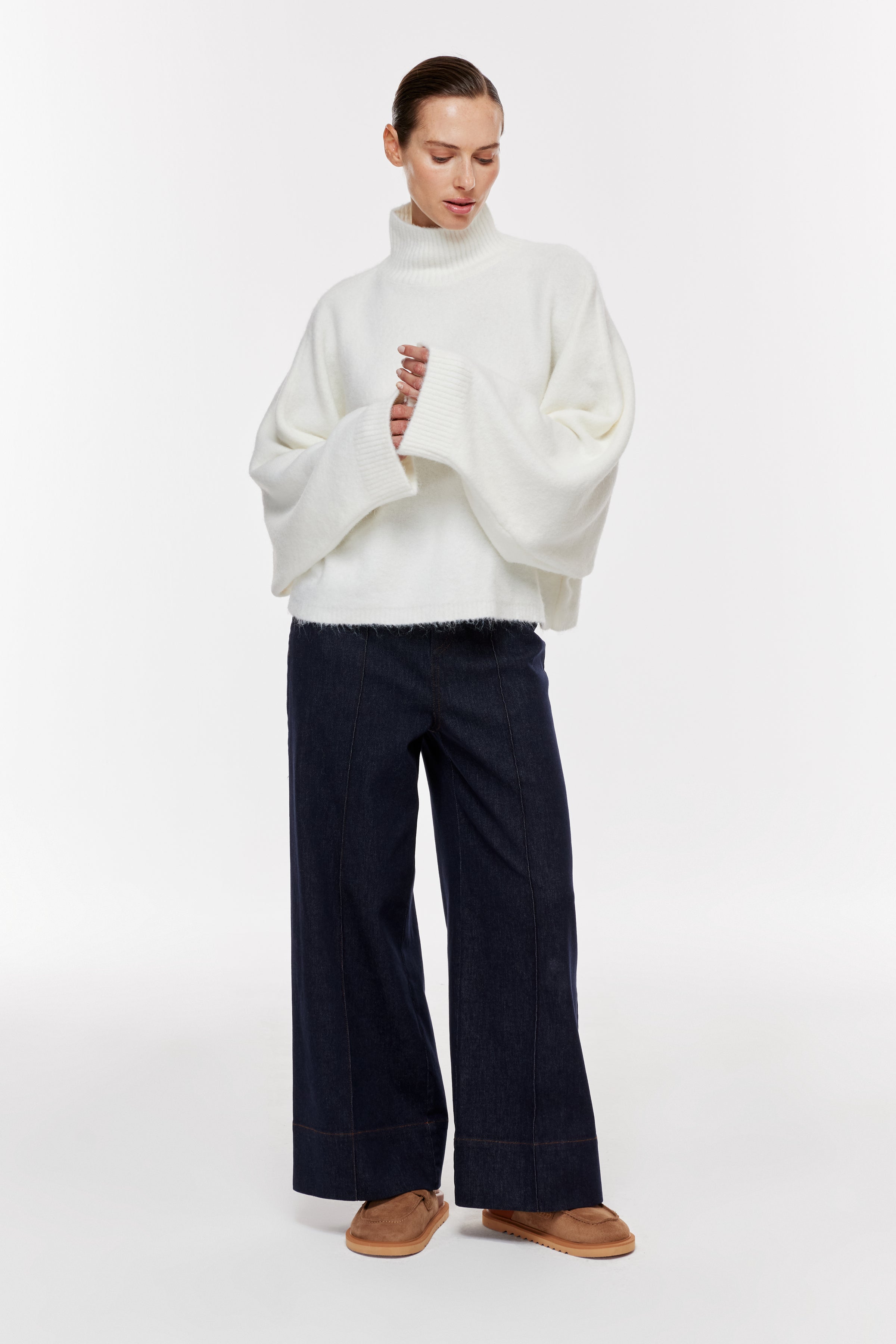Balıkçı yaka, düşük omuzlu ve ekstra uzun balon kollu kazak.