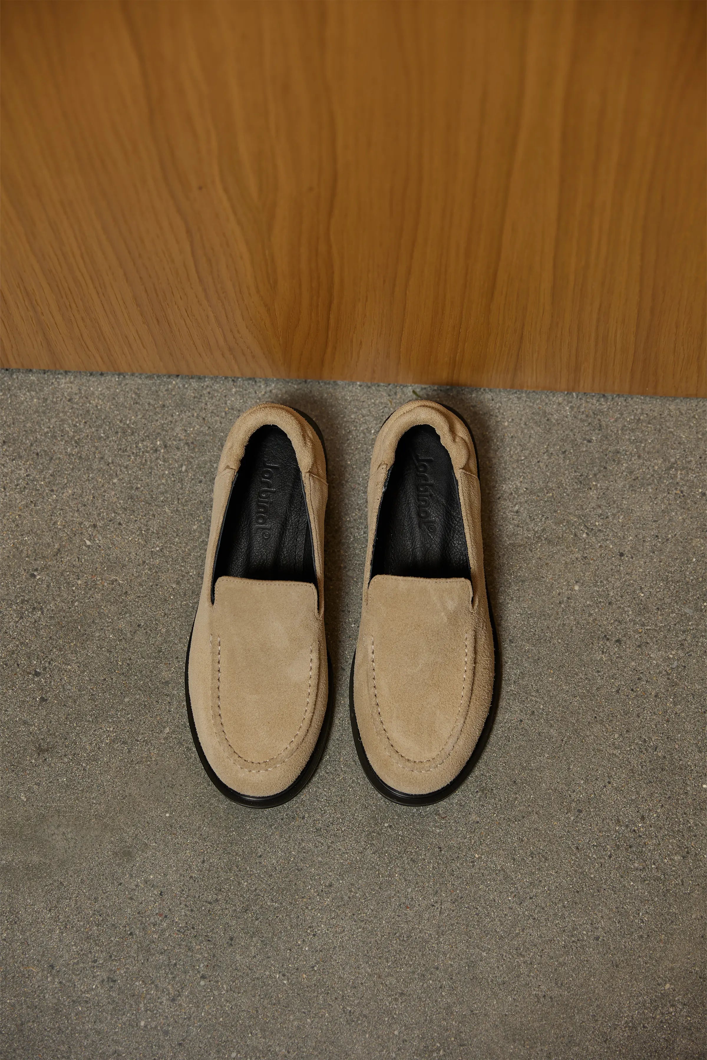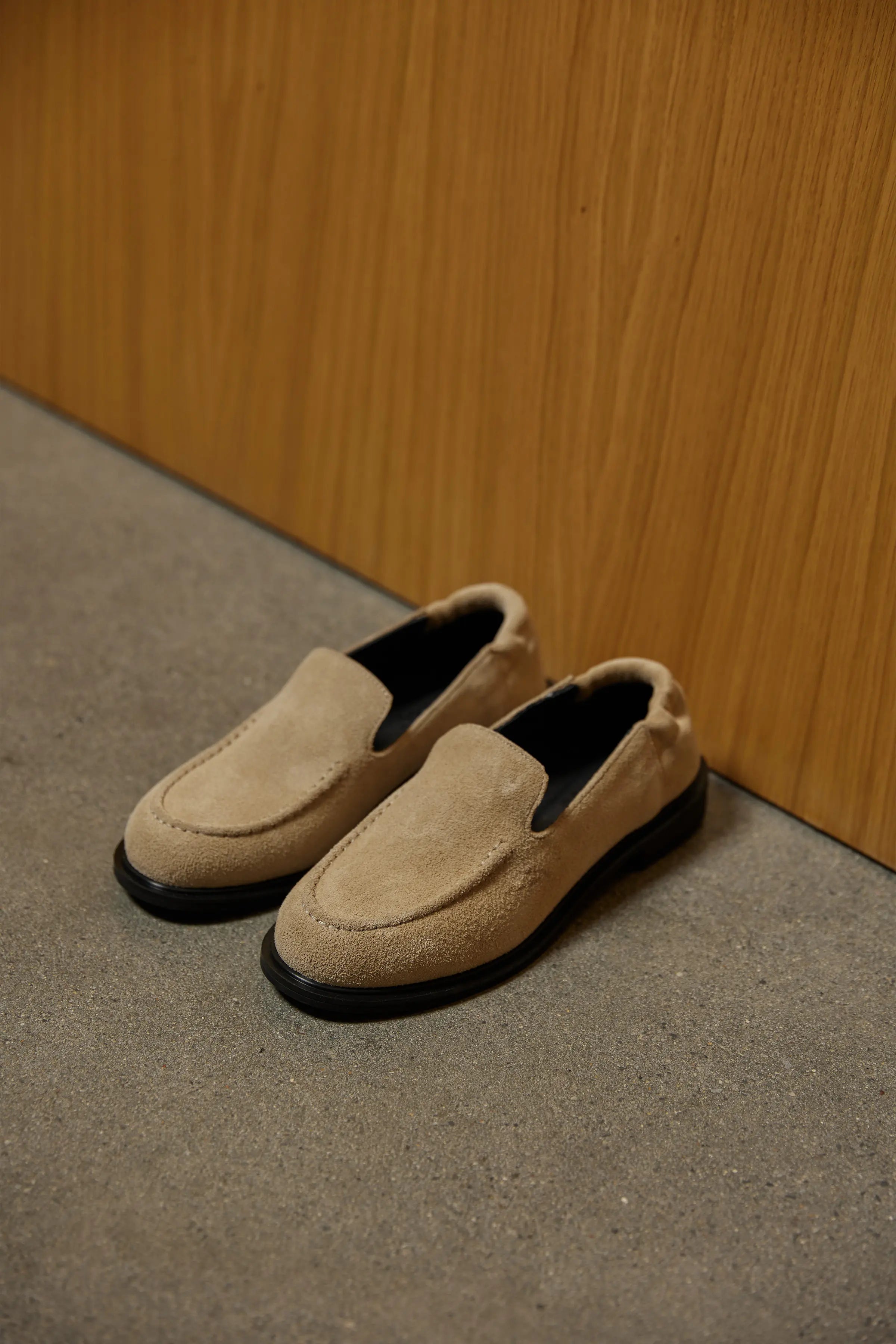 Bej rengi gerçek deri süet loafer. Arka kısmı büzgülü ve lastiklidir.