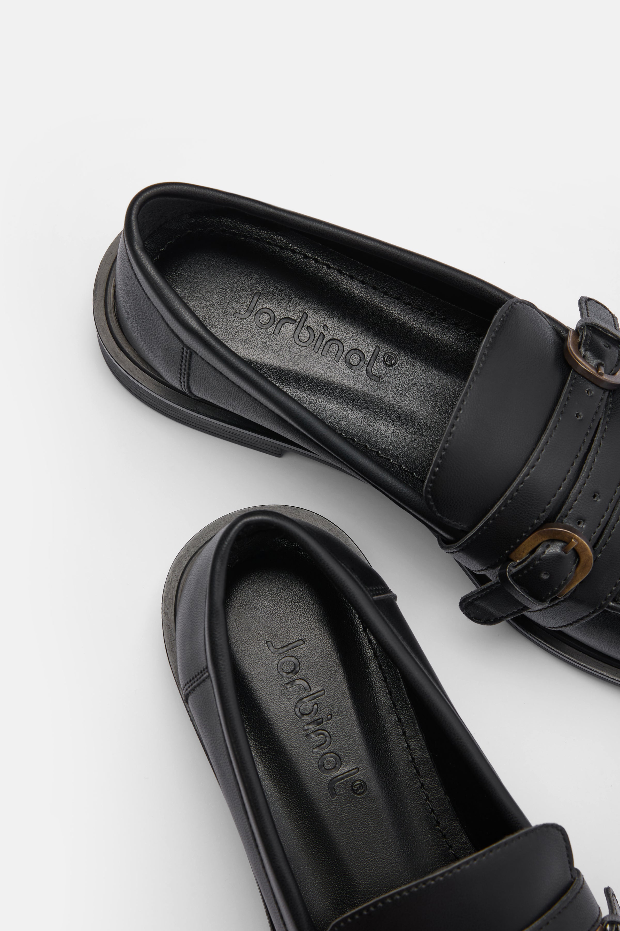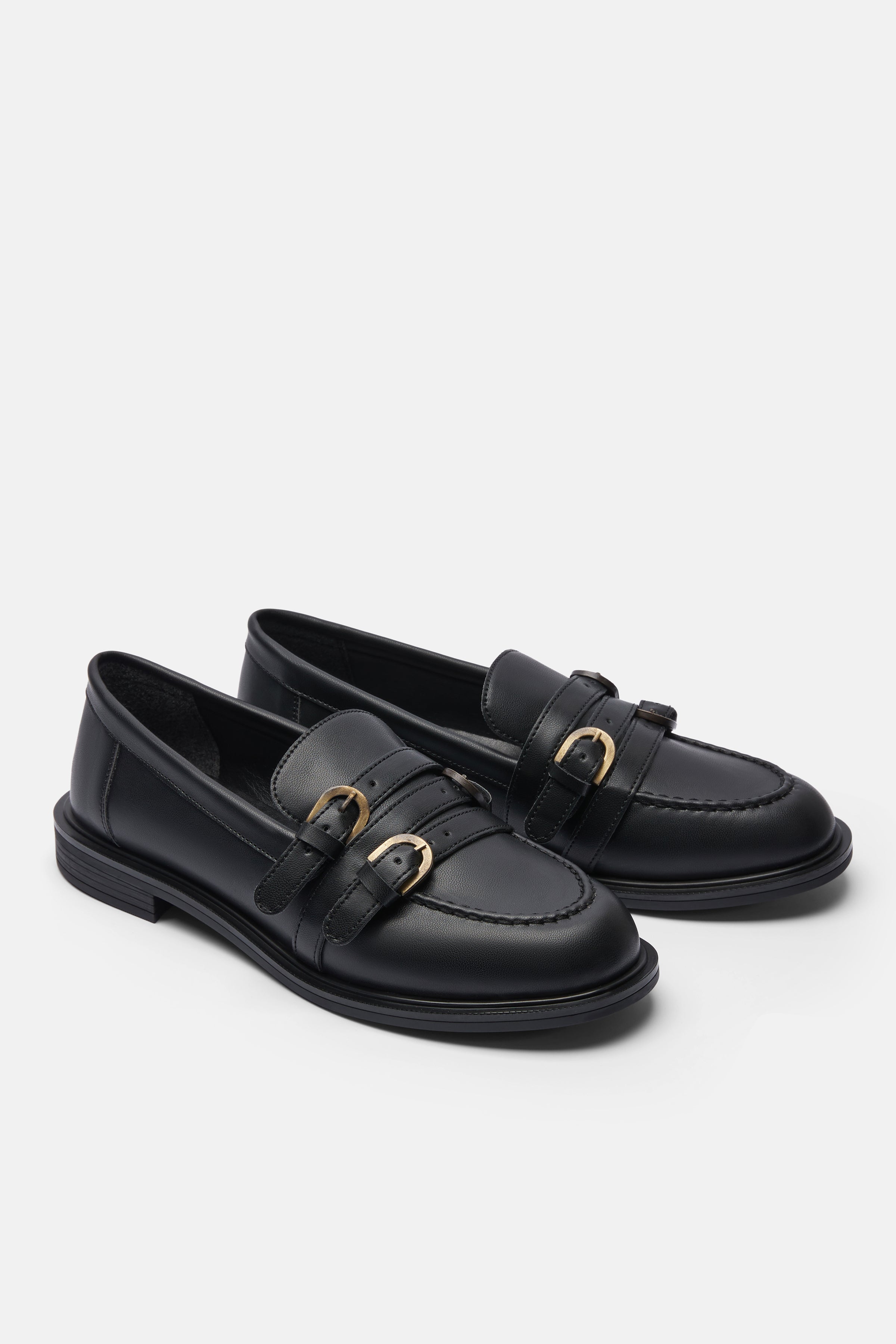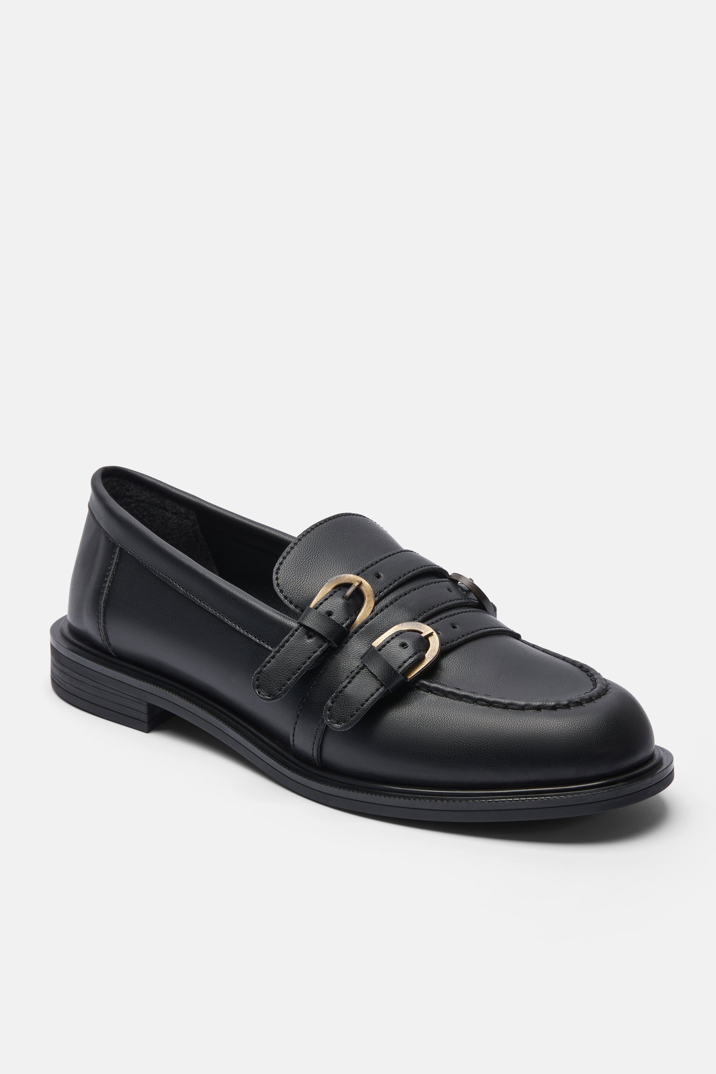 Siyah renkte vegan deri loafer. Yuvarlak burunlu. Ön kısmında üç adet bant detayı bulunur.