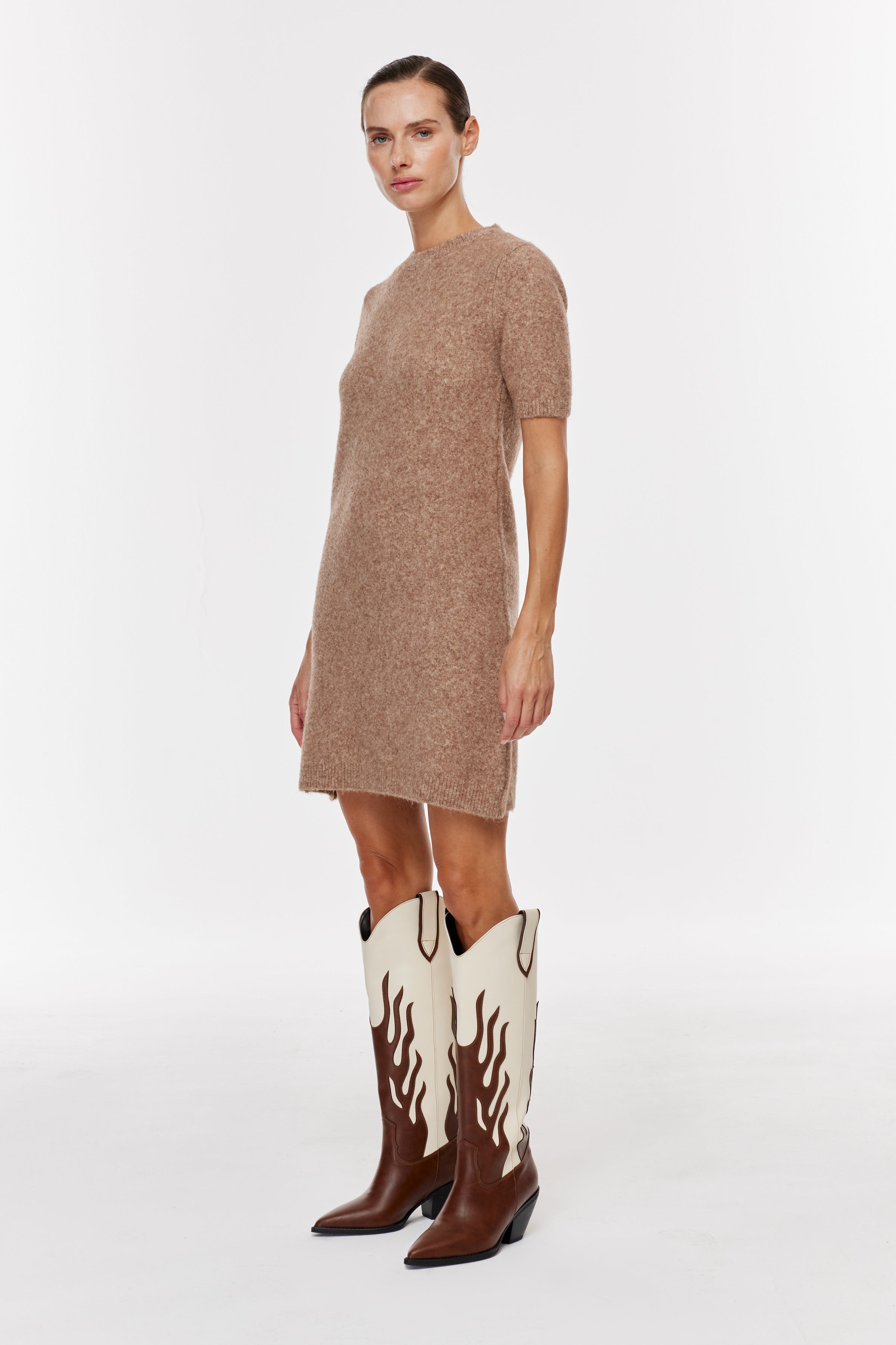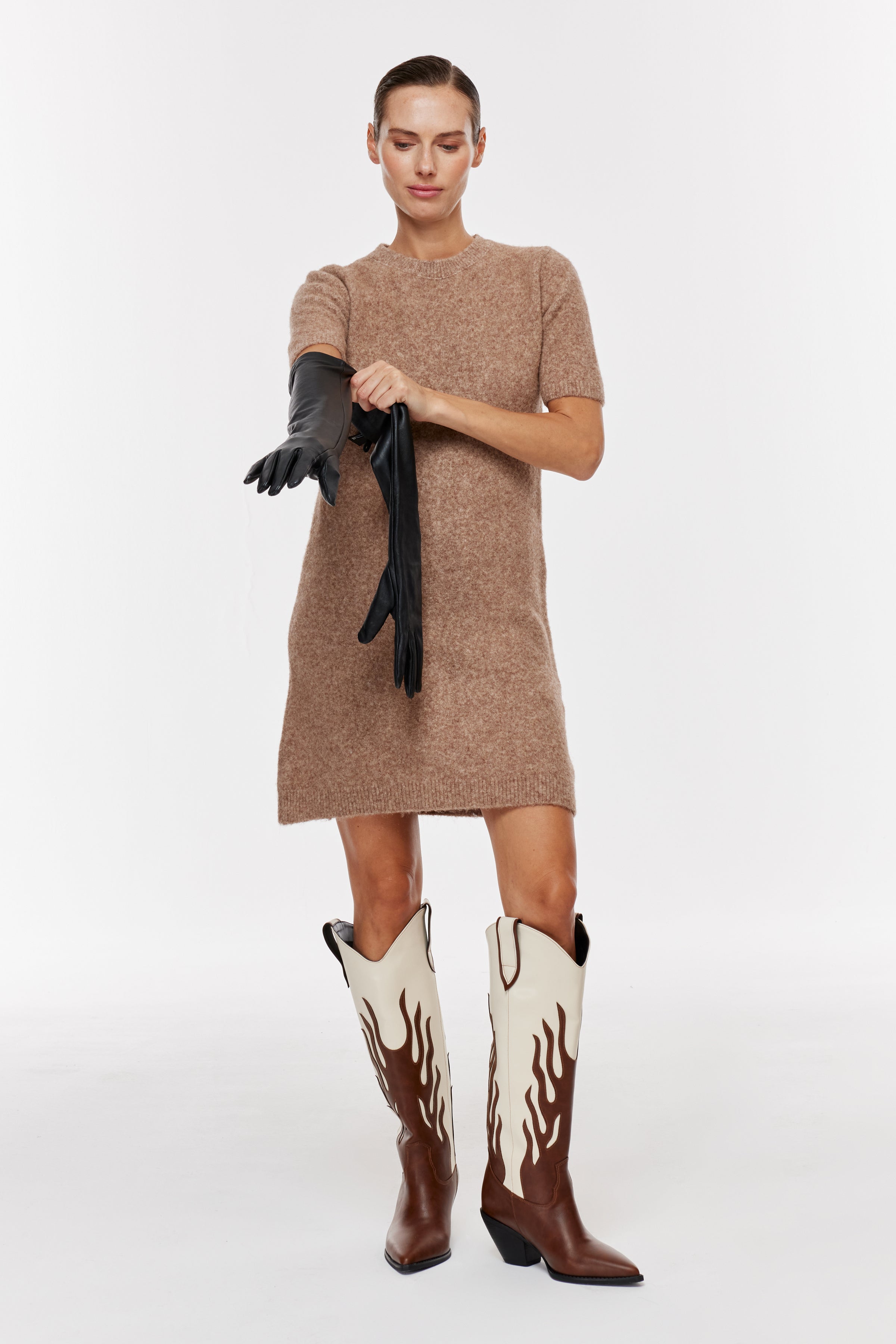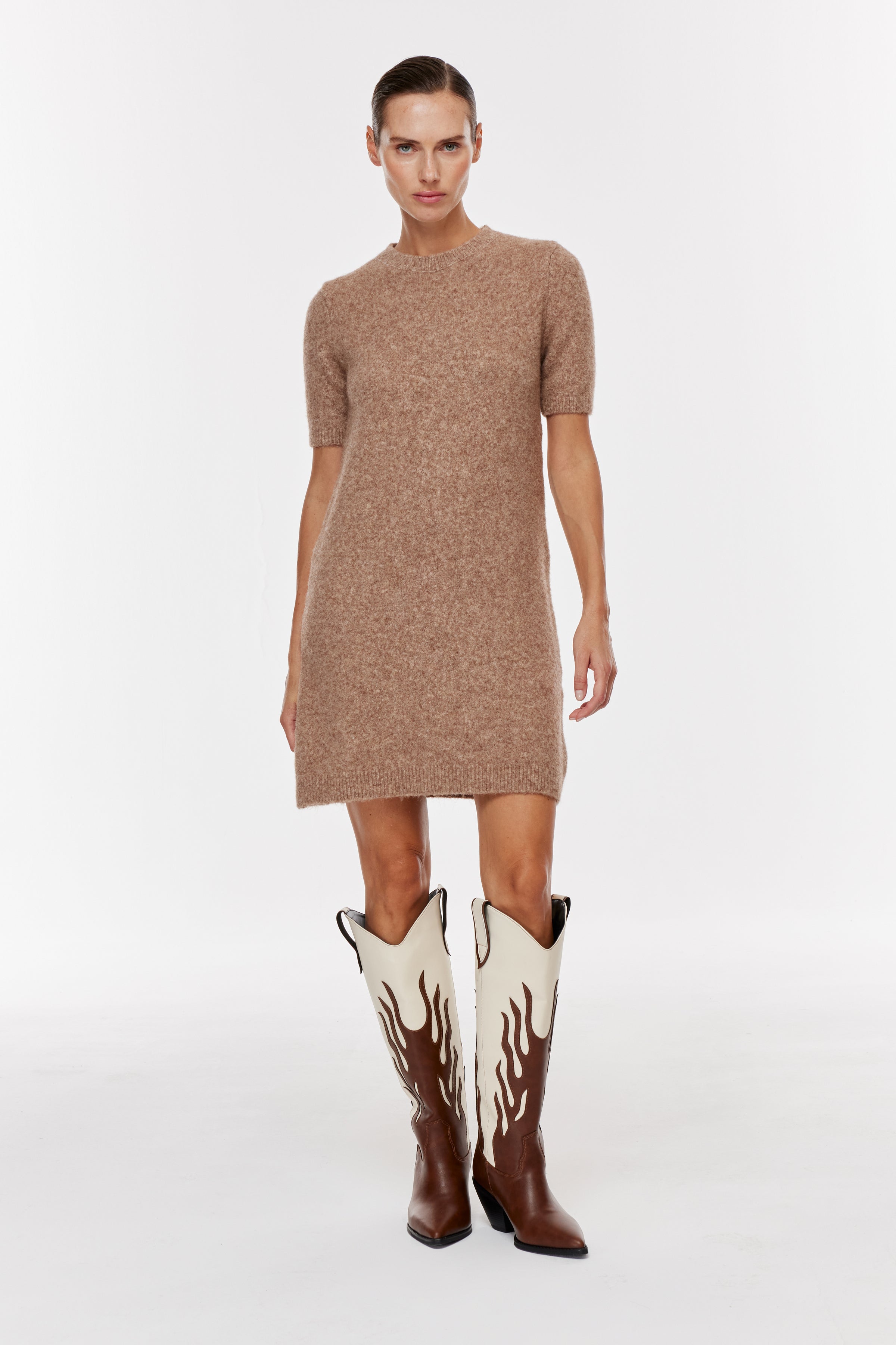 Bisiklet yaka, kısa kollu, düz kesim mini elbise.