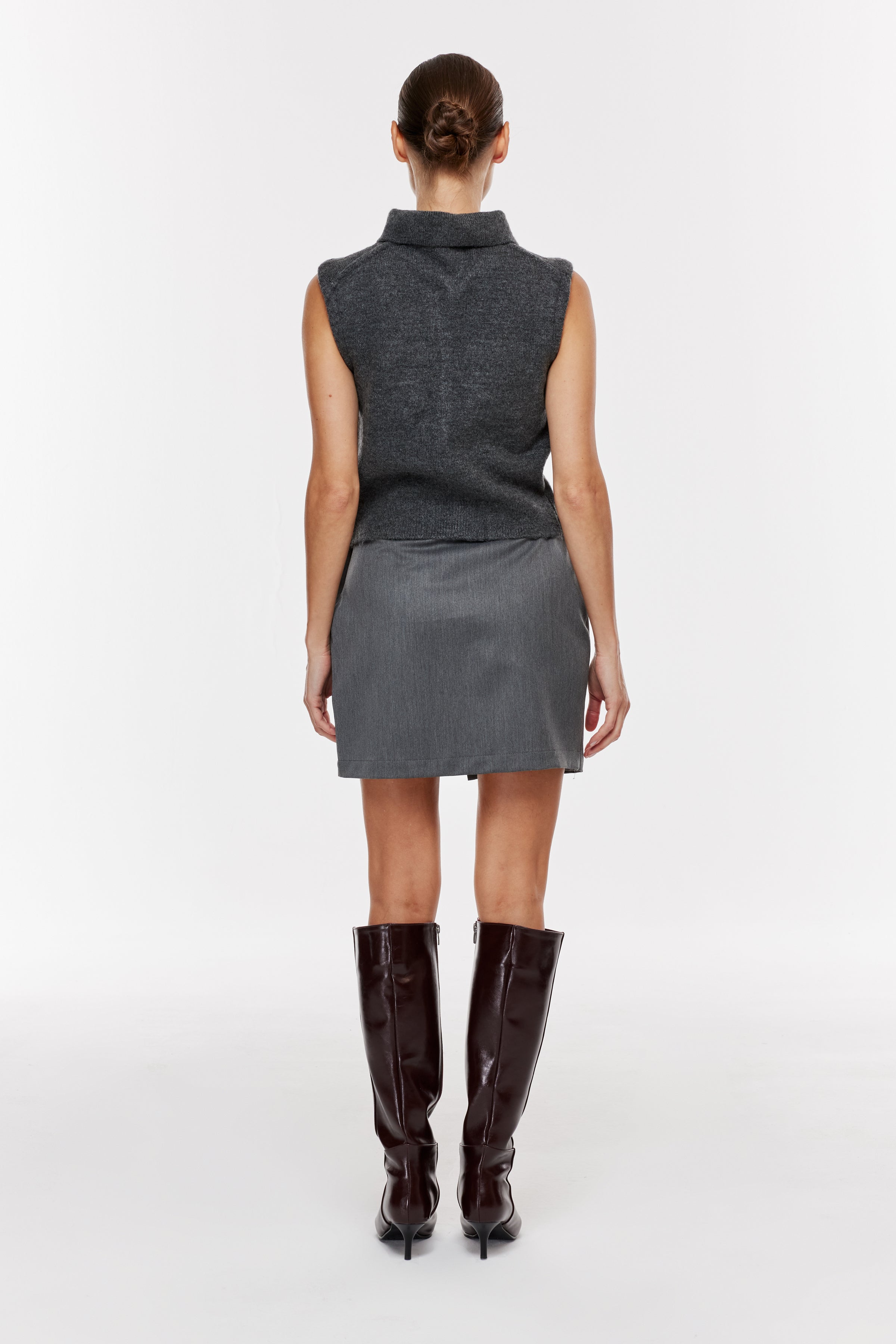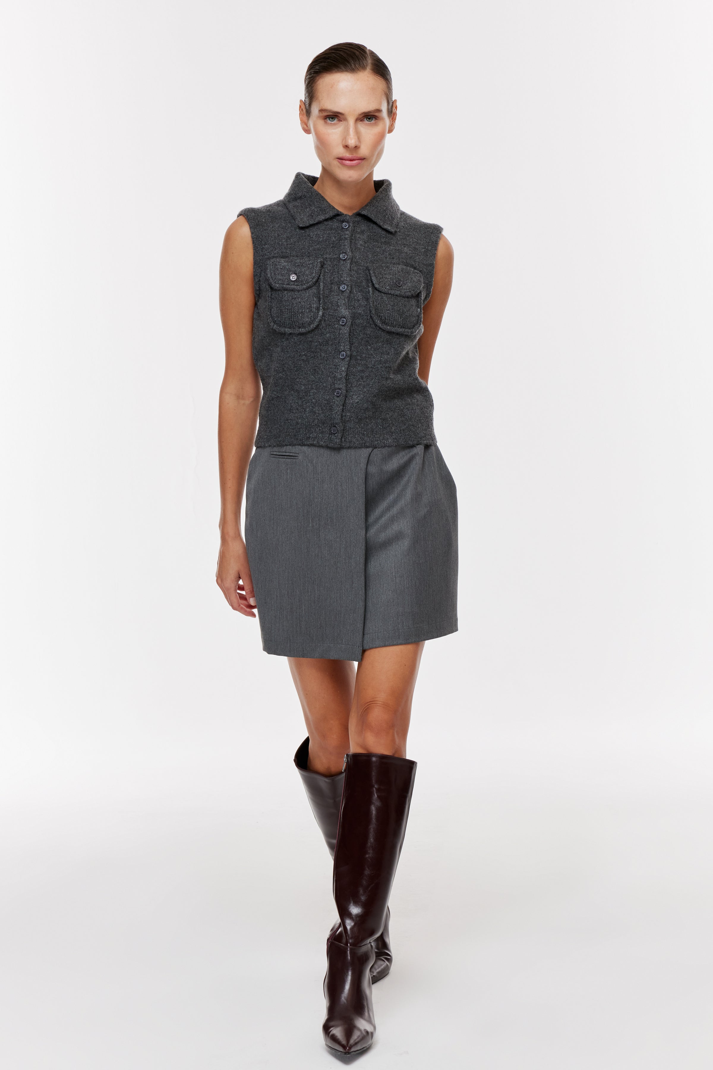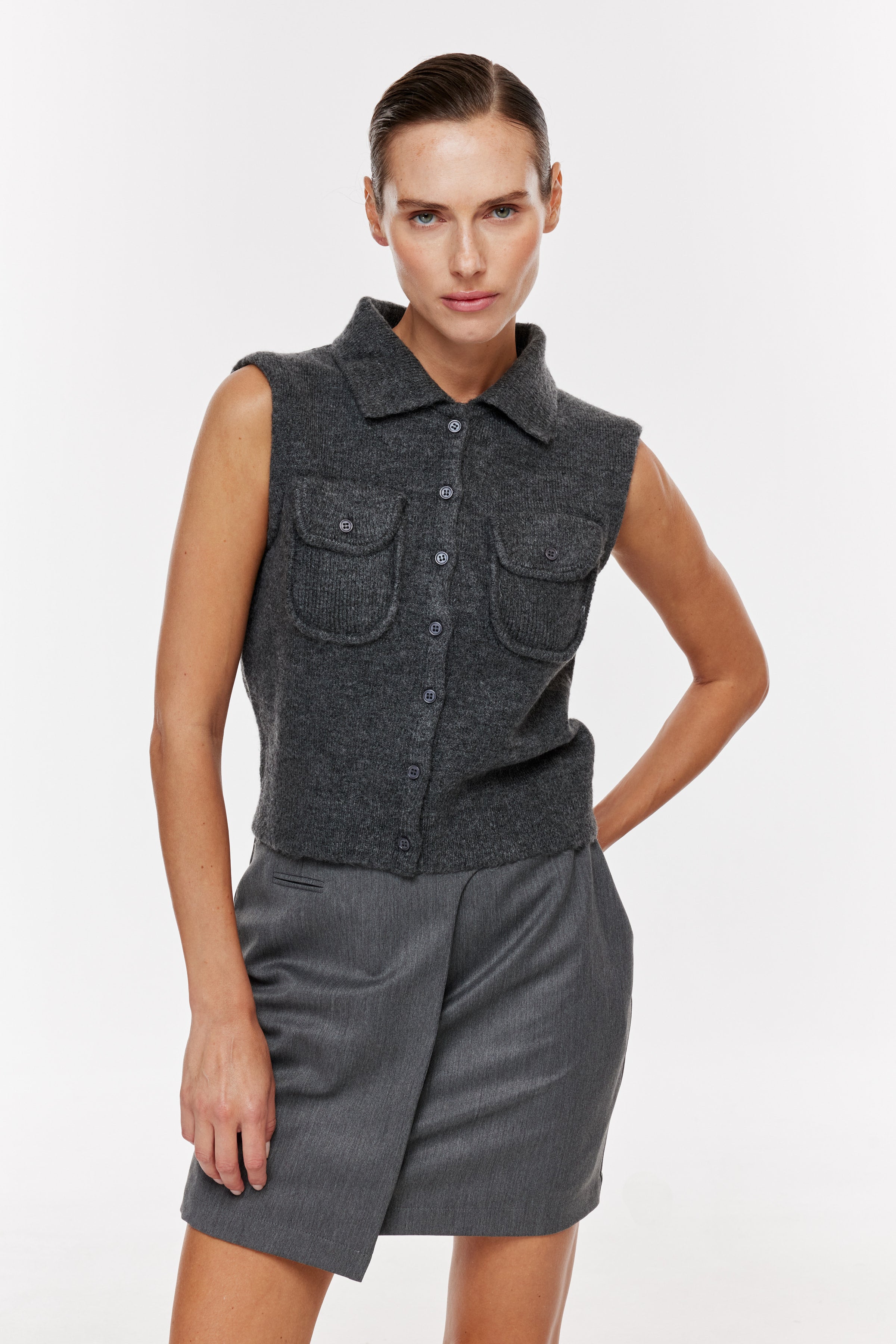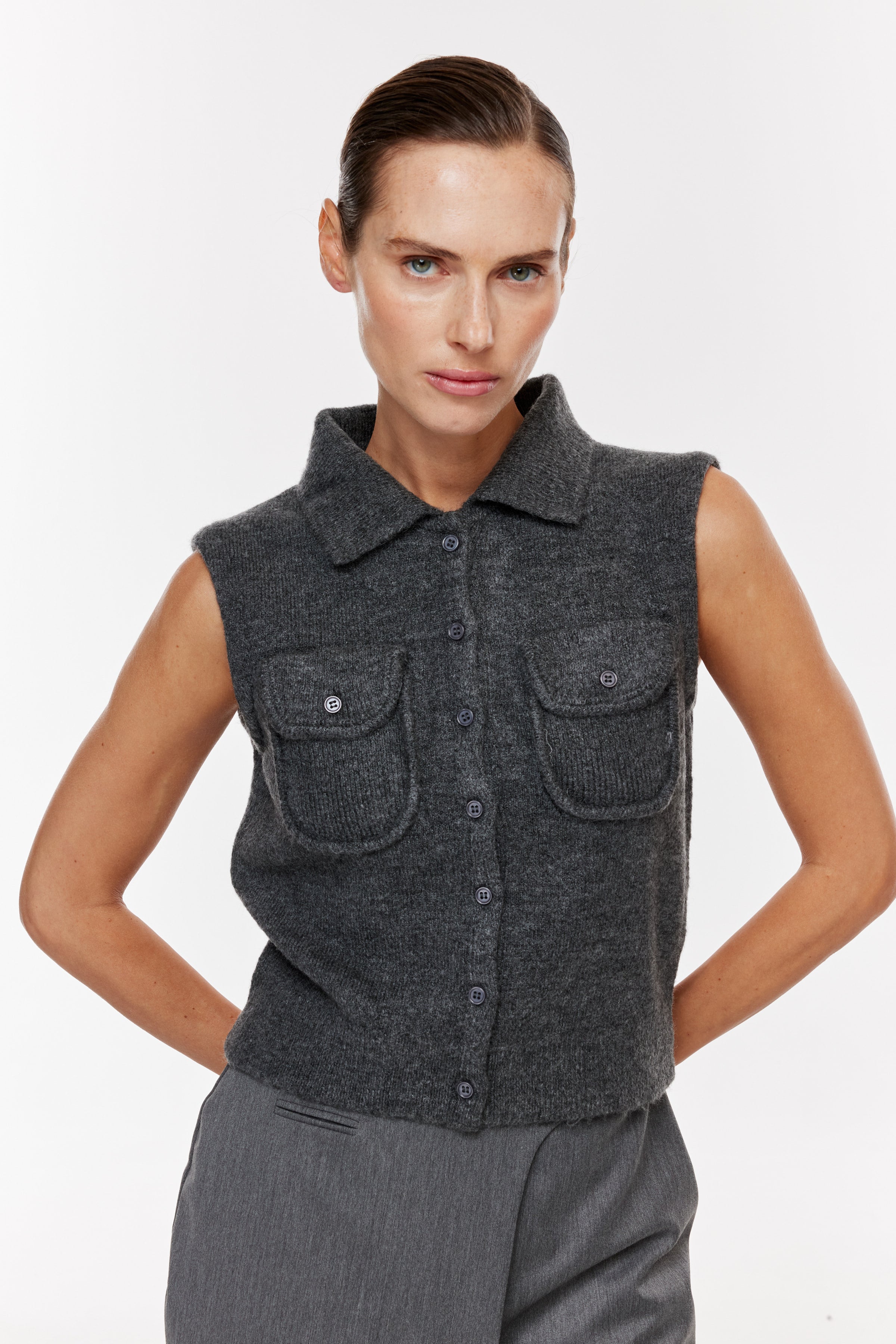 Gömlek yaka, kolsuz yelek. Göğsü kapaklı yama cepli, önden düğme iliklemeli.