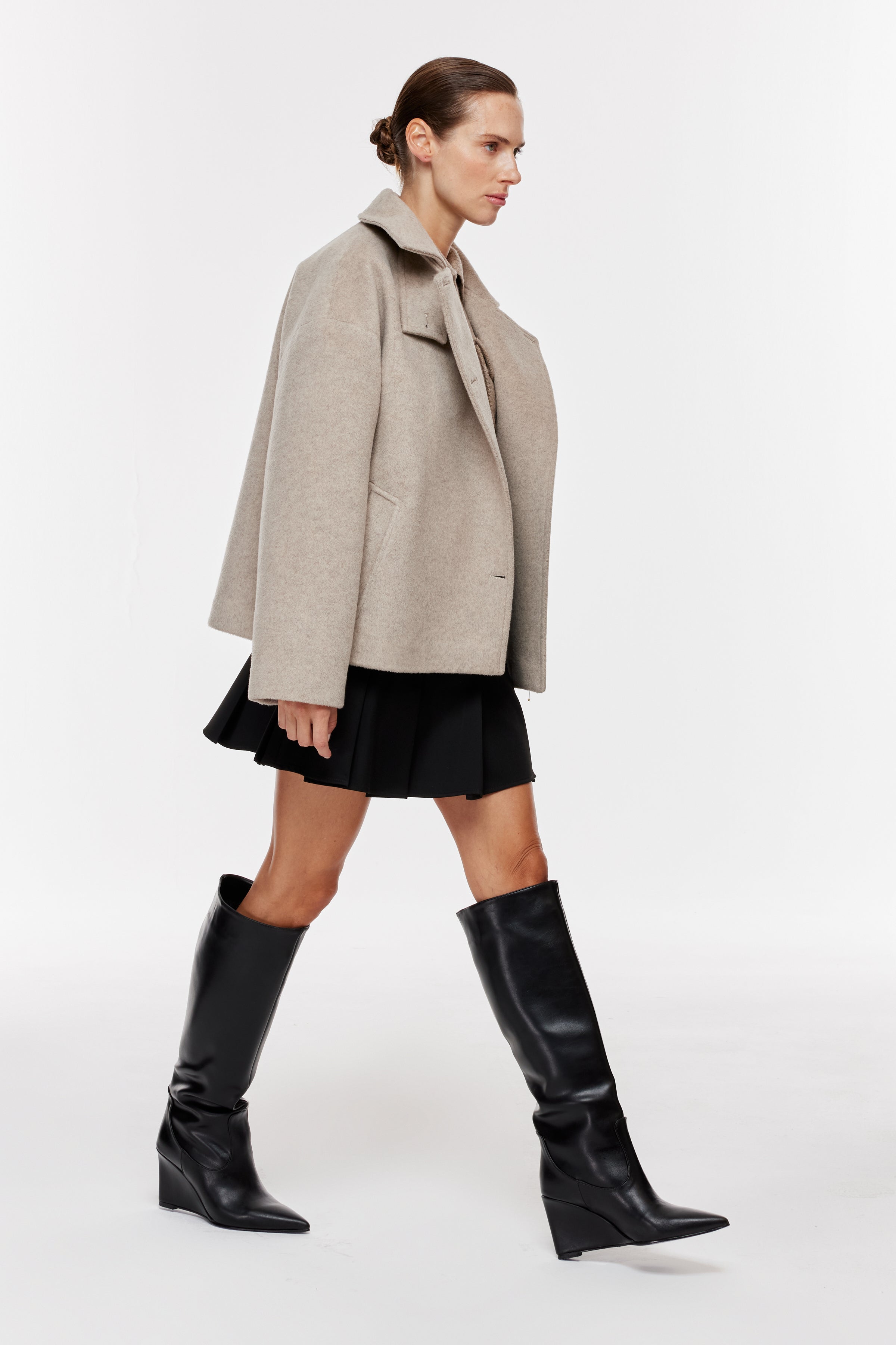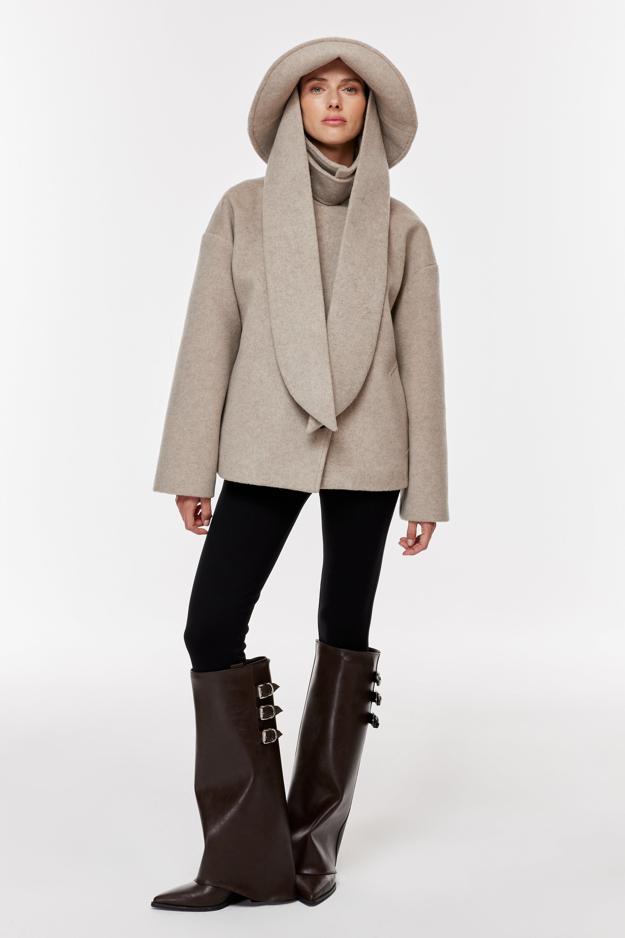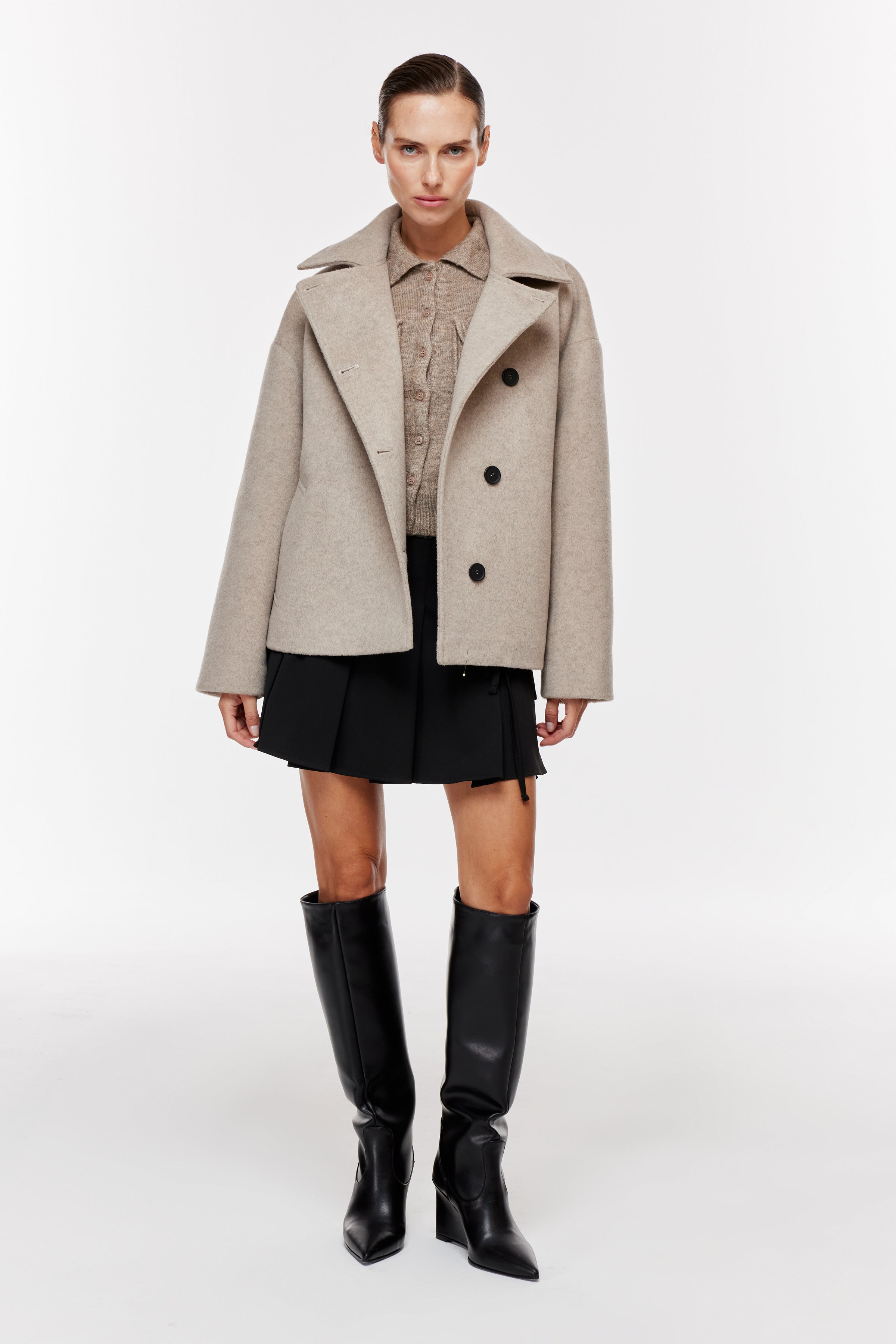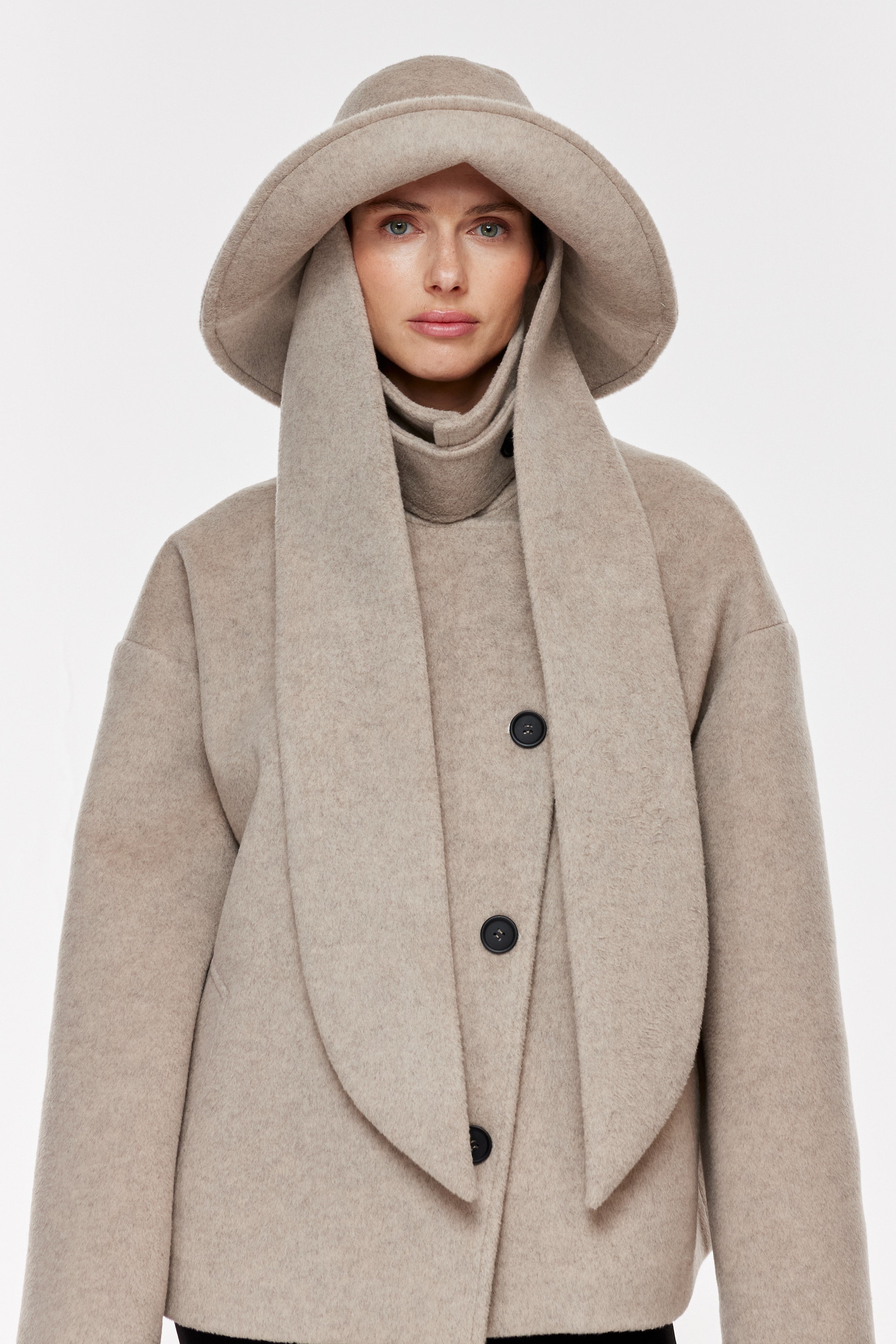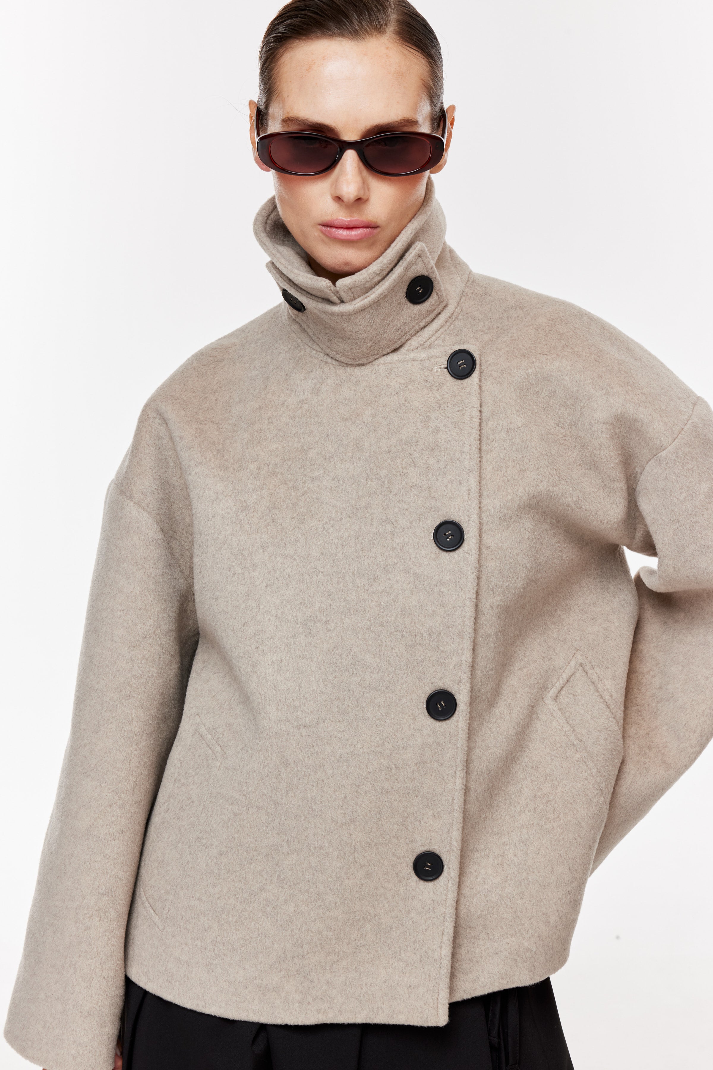 Geniş yaka, uzun kollu kaşe kaban. Önden asimetrik, kontrast düğme kapamalı. Yan cepli.