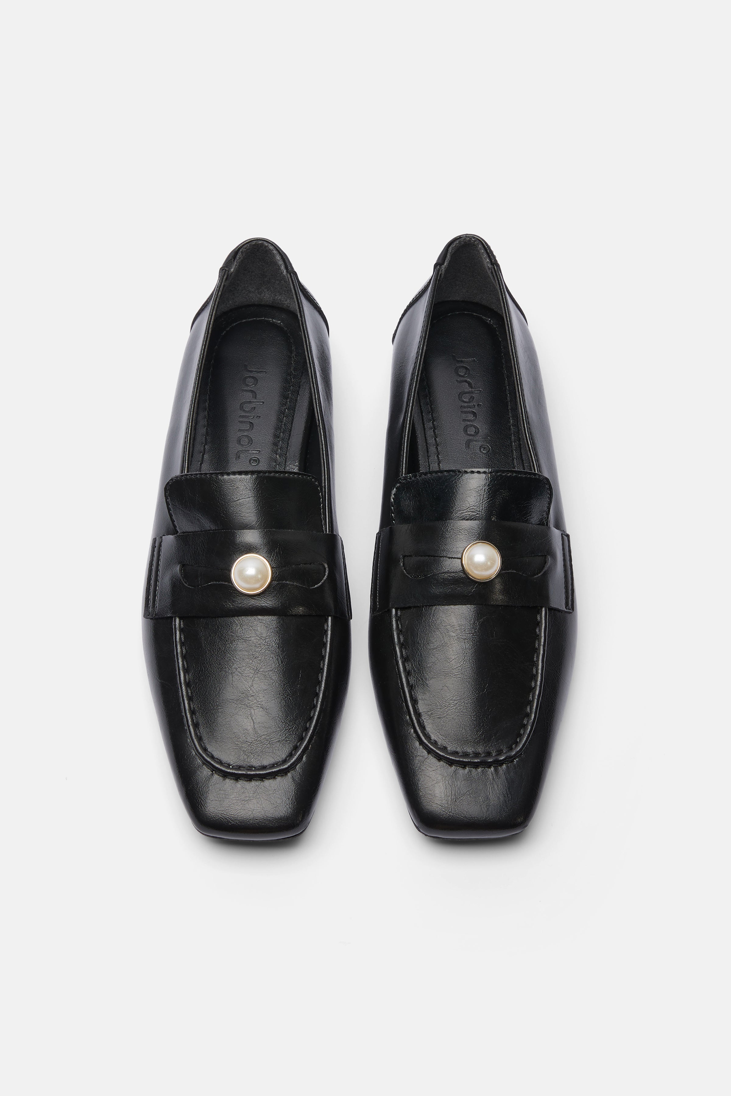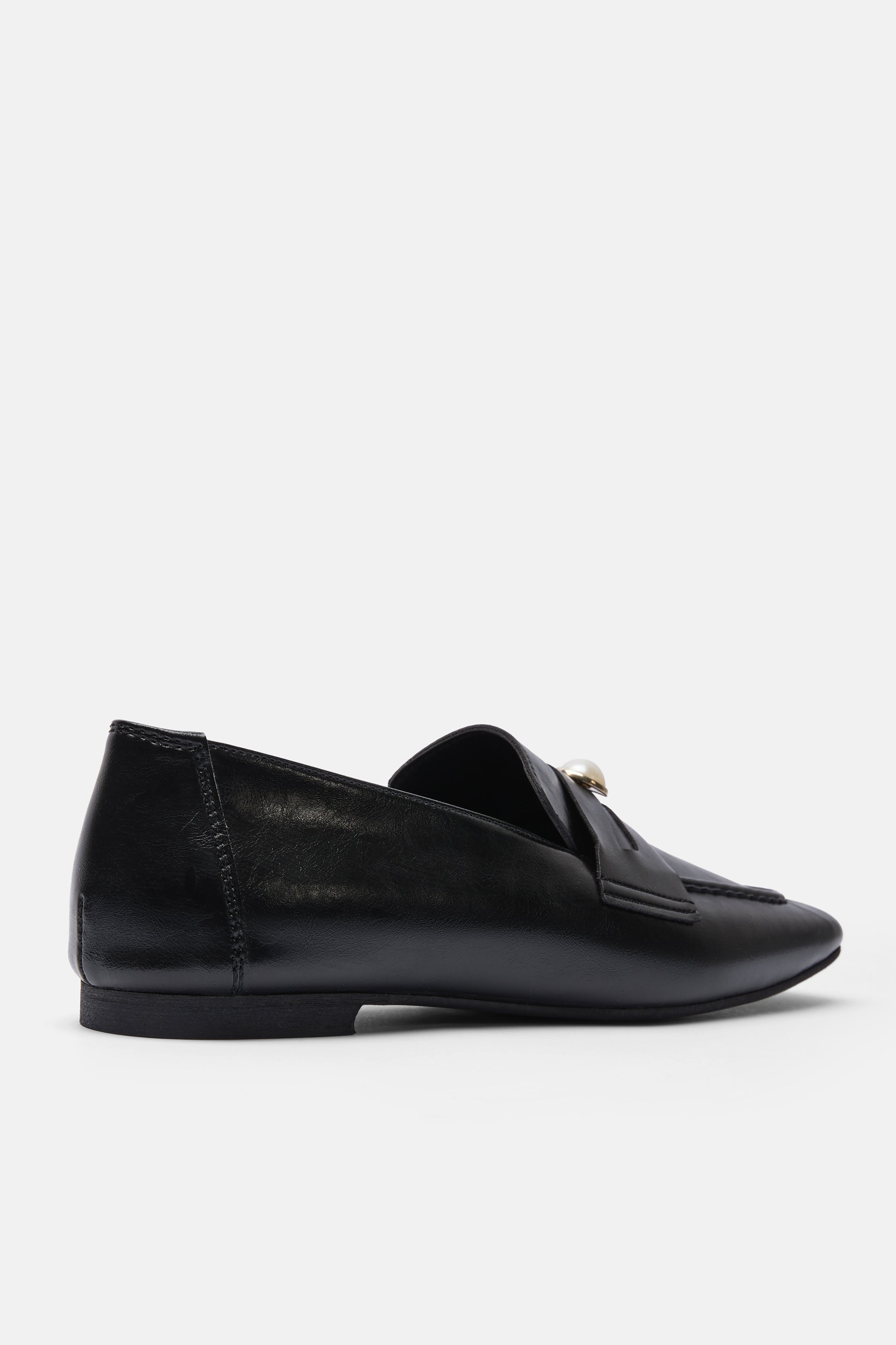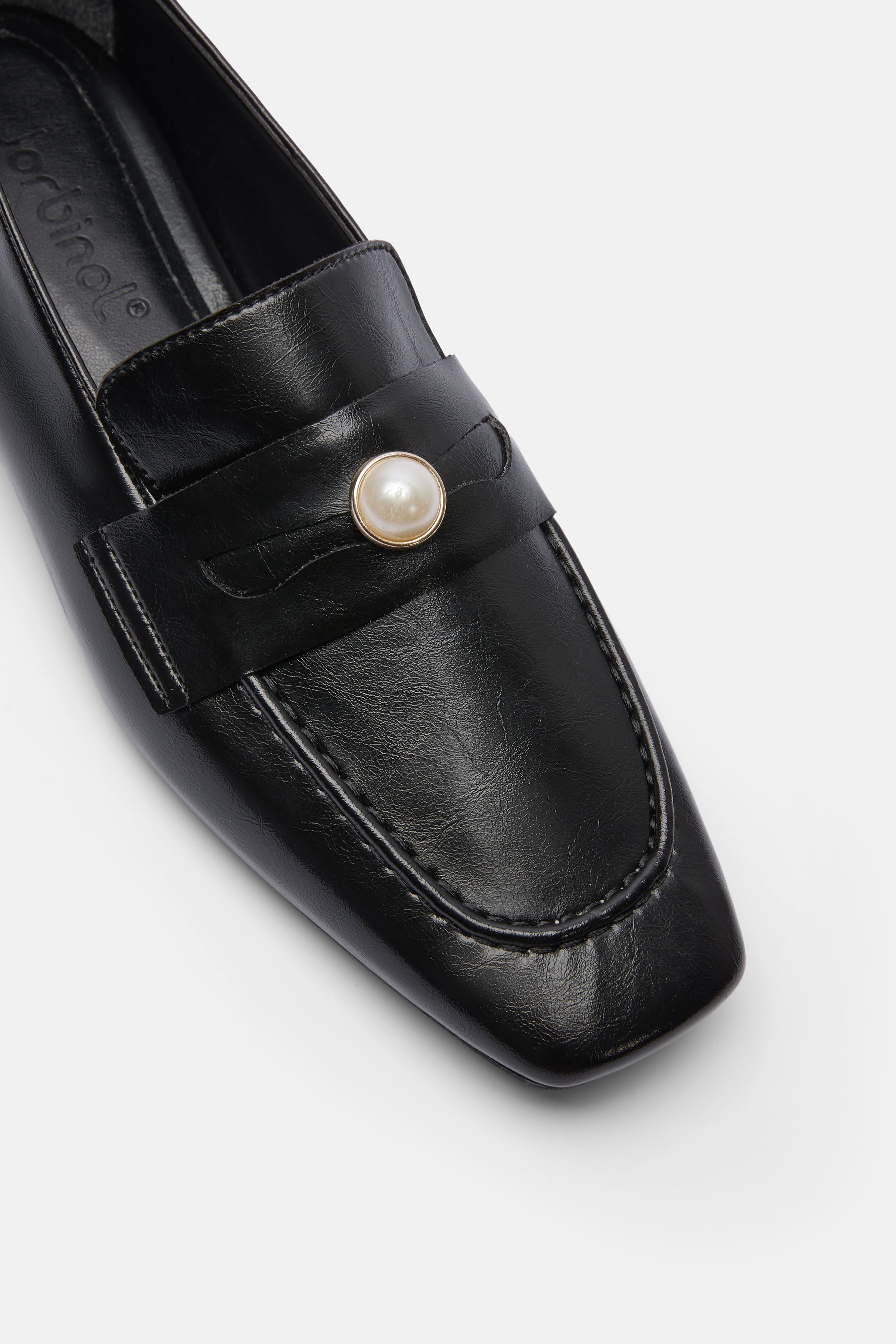 Siyah renkte Kare burunlu vegan deri babet. Bant üzerinde inci detayı bulunur.