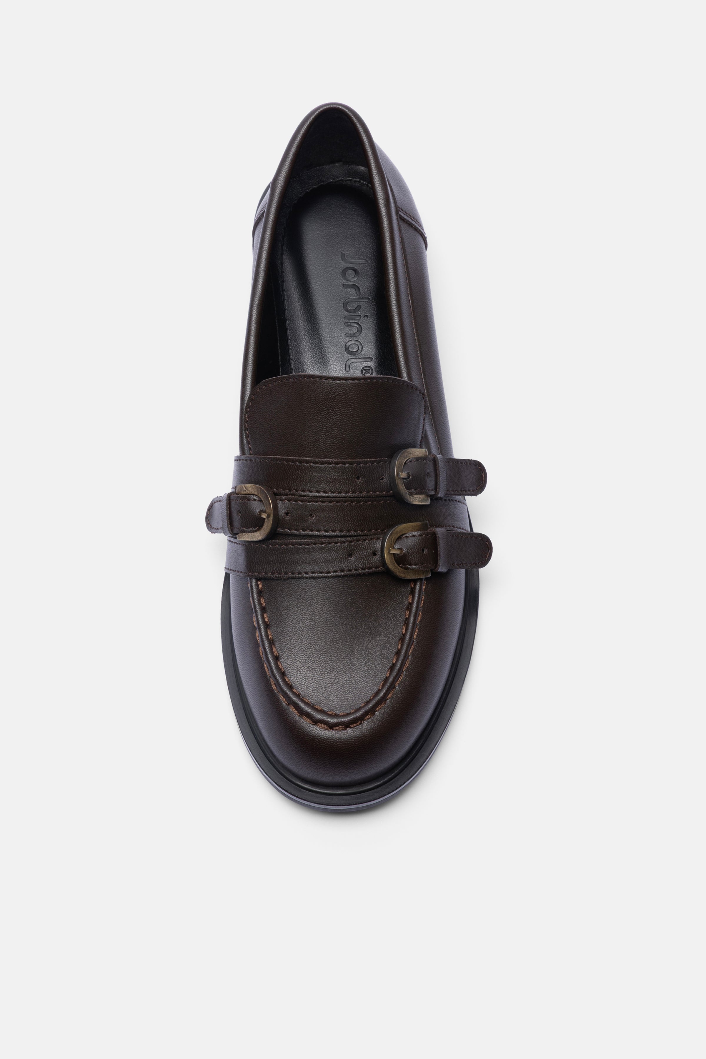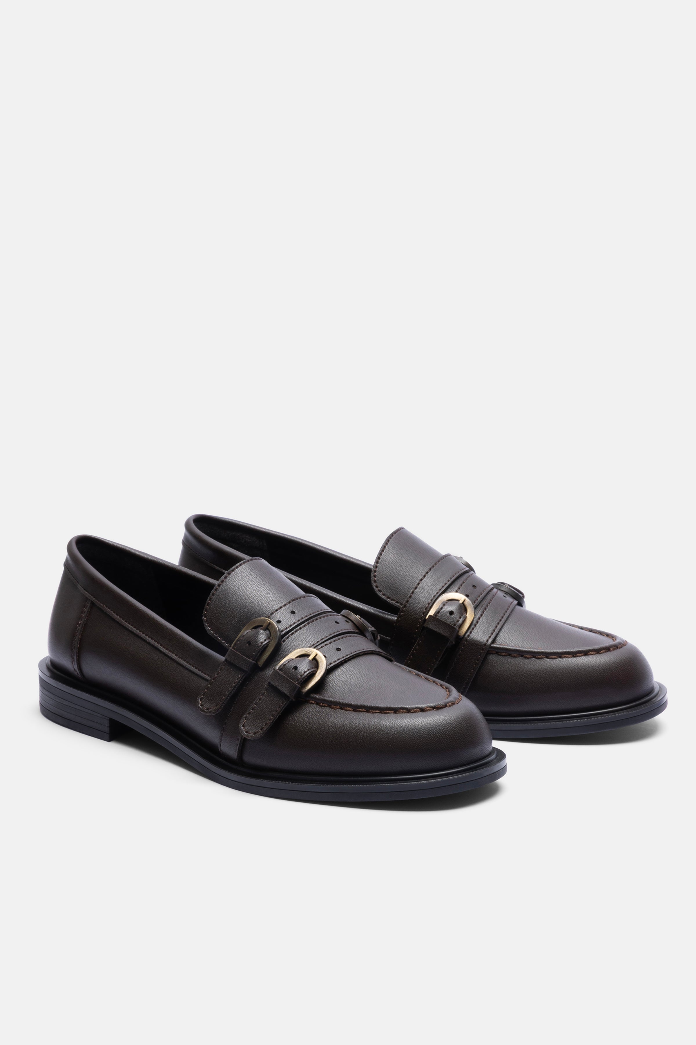 Kahverengi renkte vegan deri loafer. Yuvarlak burunlu. Ön kısmında üç adet bant detayı bulunur.