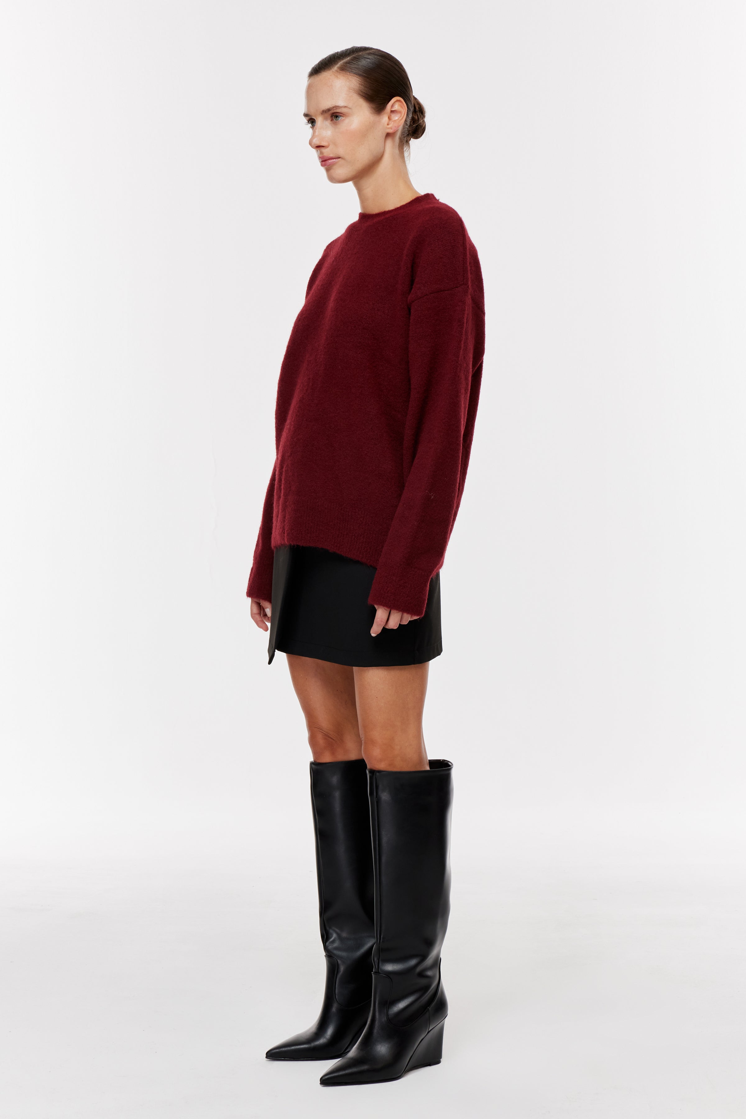 Bisiklet yaka, düşük omuzlu ve uzun kollu kazak.