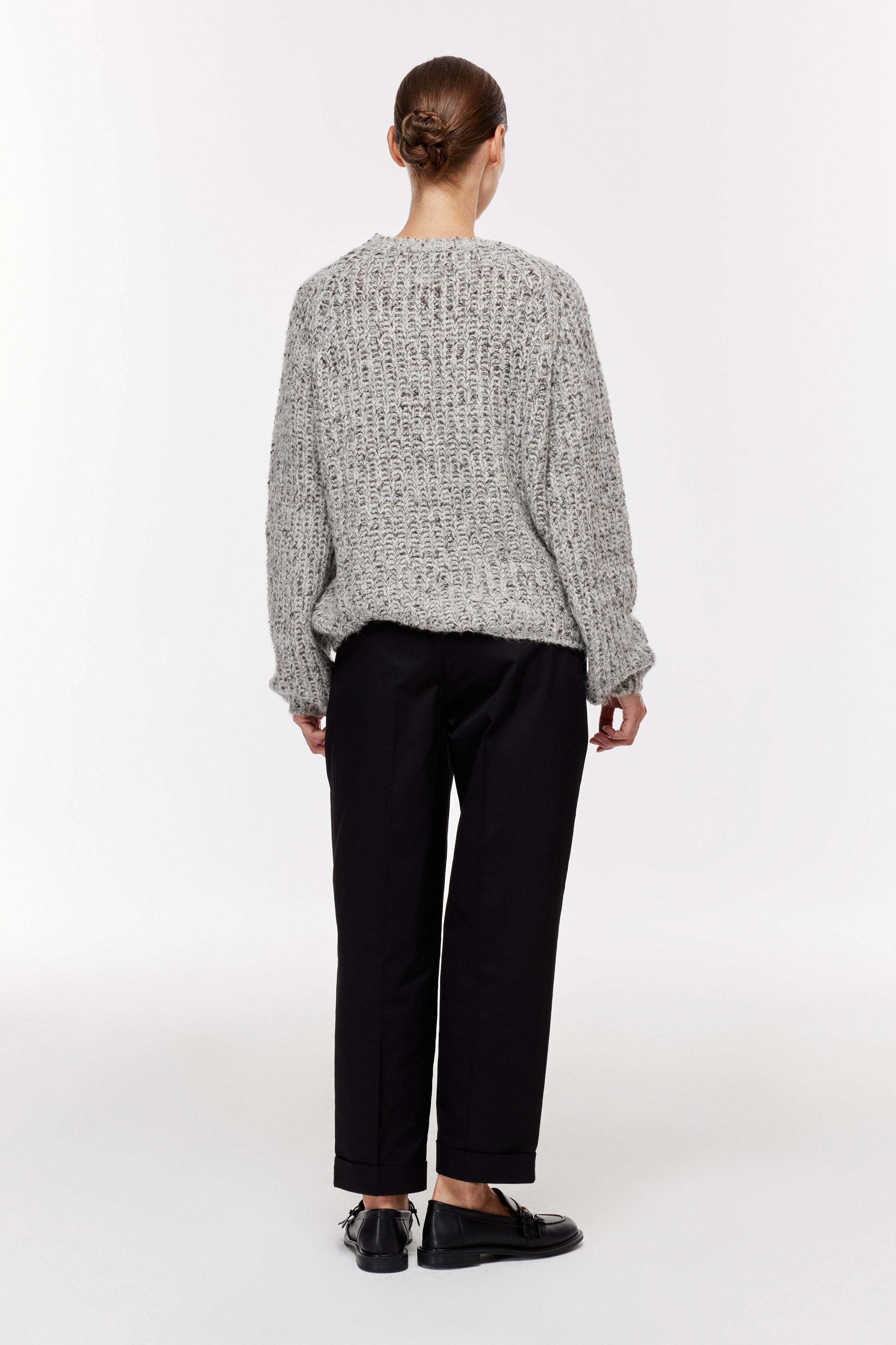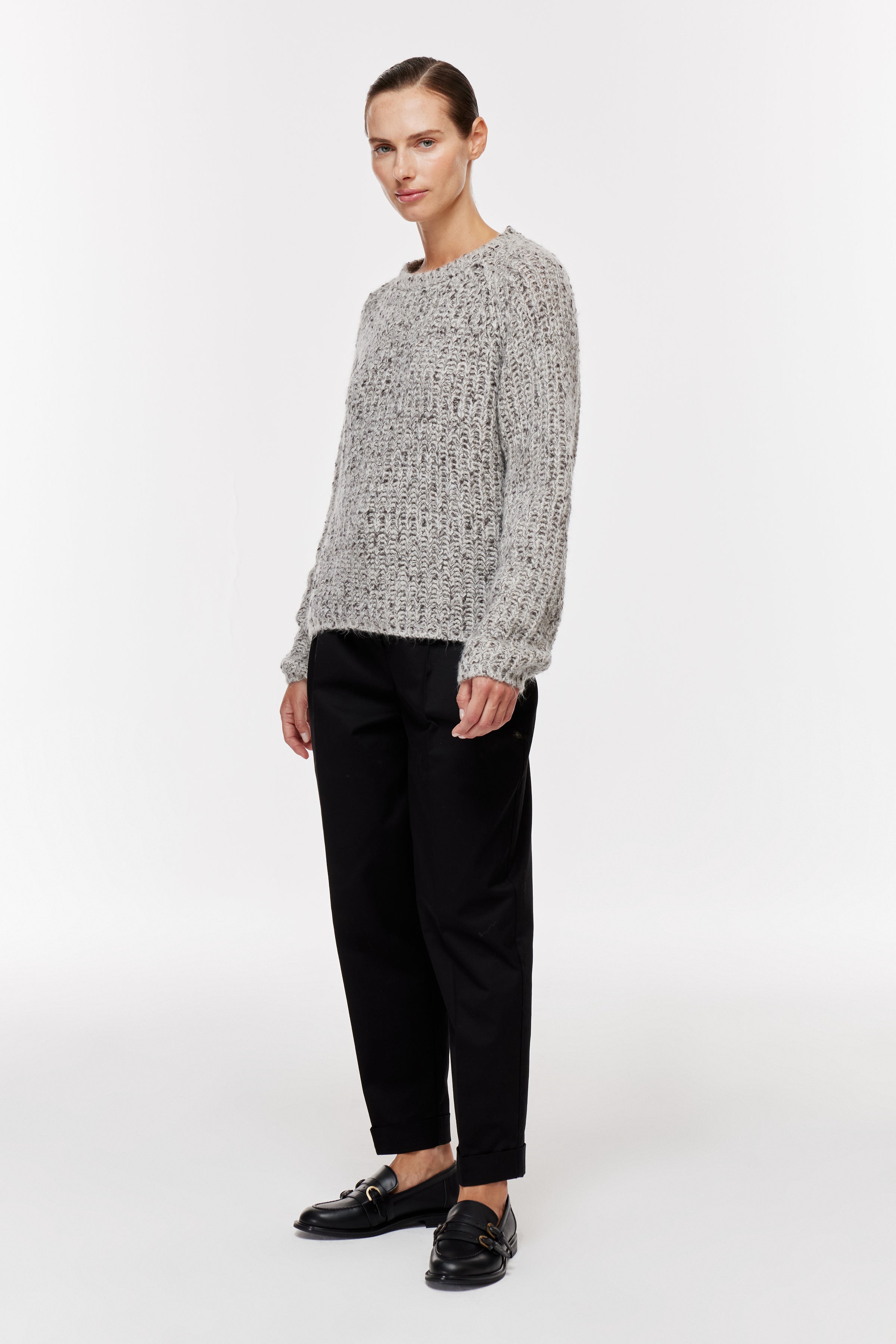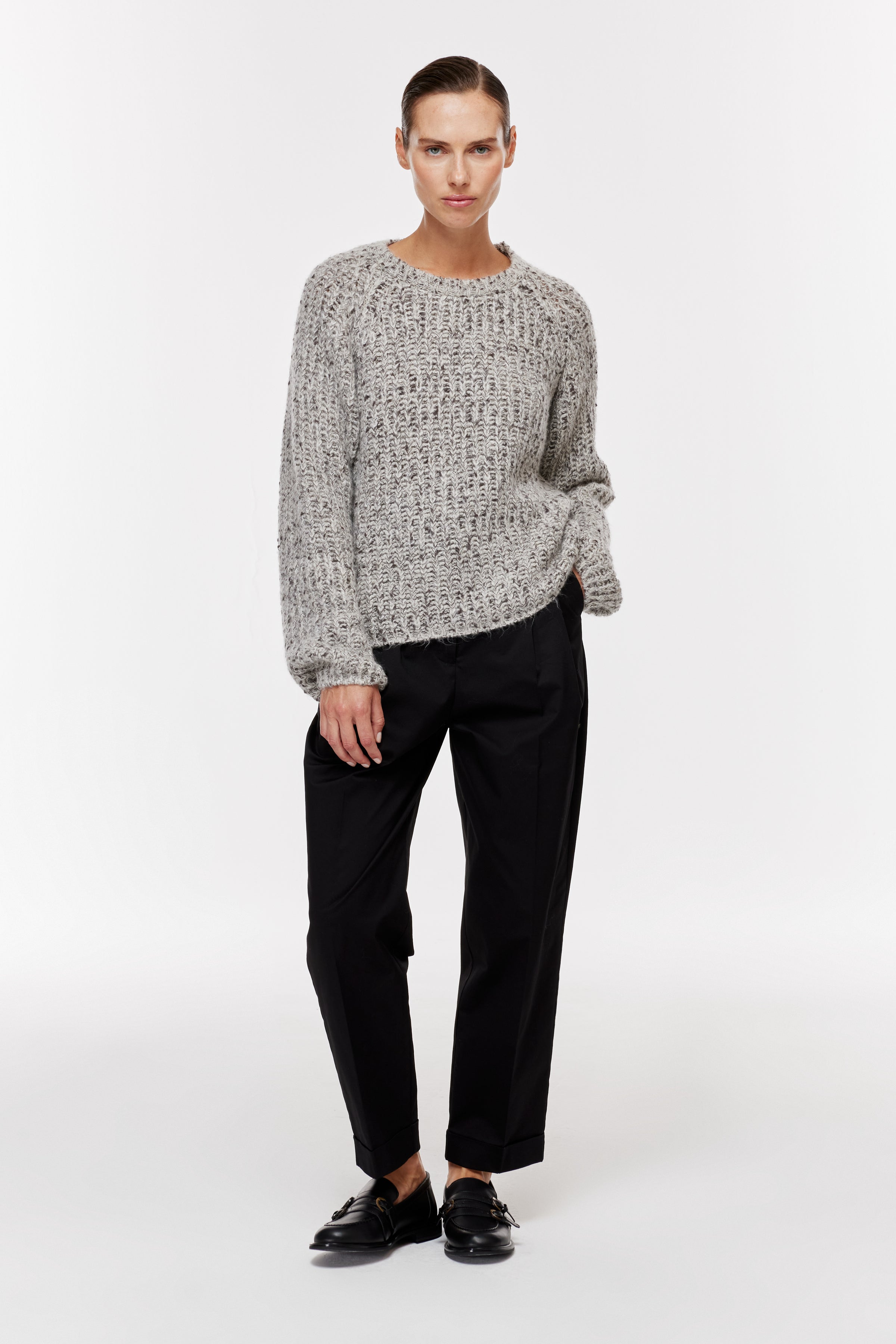 Bisiklet yaka, uzun regle kollu kazak. Hacimli ve belirgin örgü dokuya sahip.