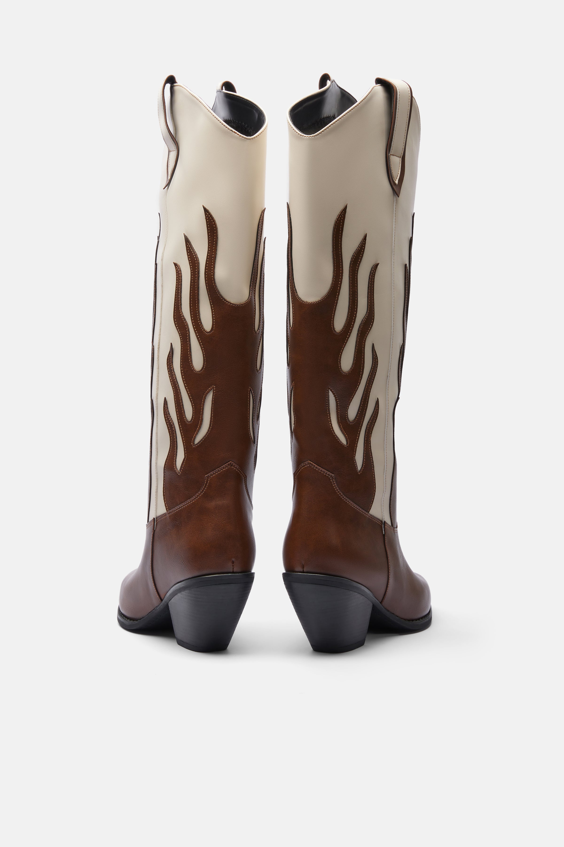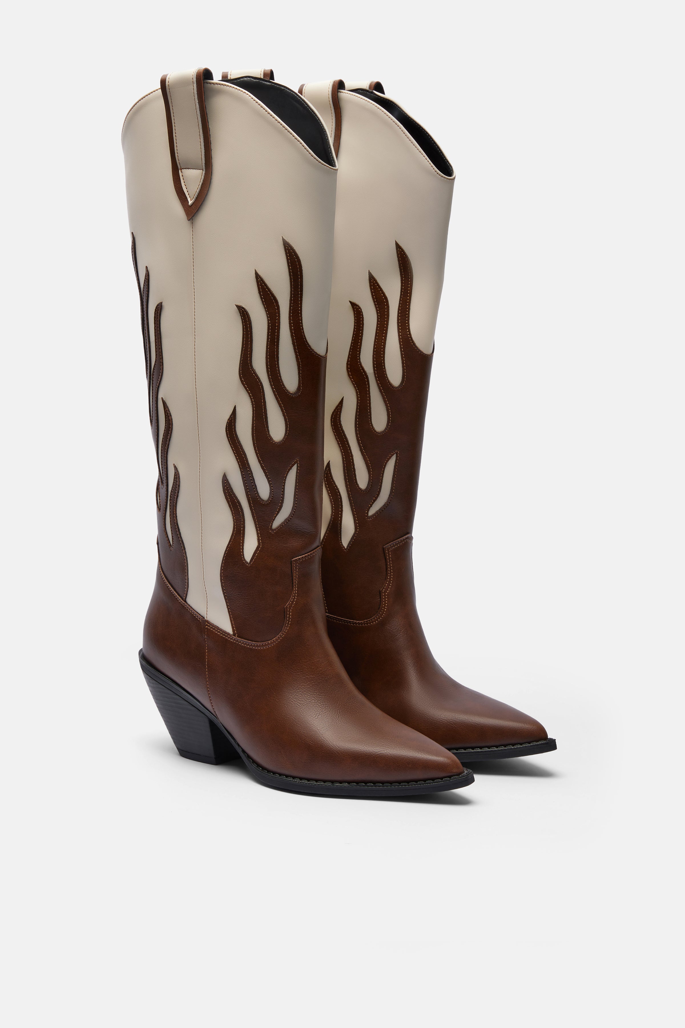 Taba beyaz, alev desenli uzun kovboy çizmesi. Sivri burunlu ve açılı kalın topuklu. Kolay giyim için kenarlarda çekme halkaları bulunur. Topuk: 7 cm.