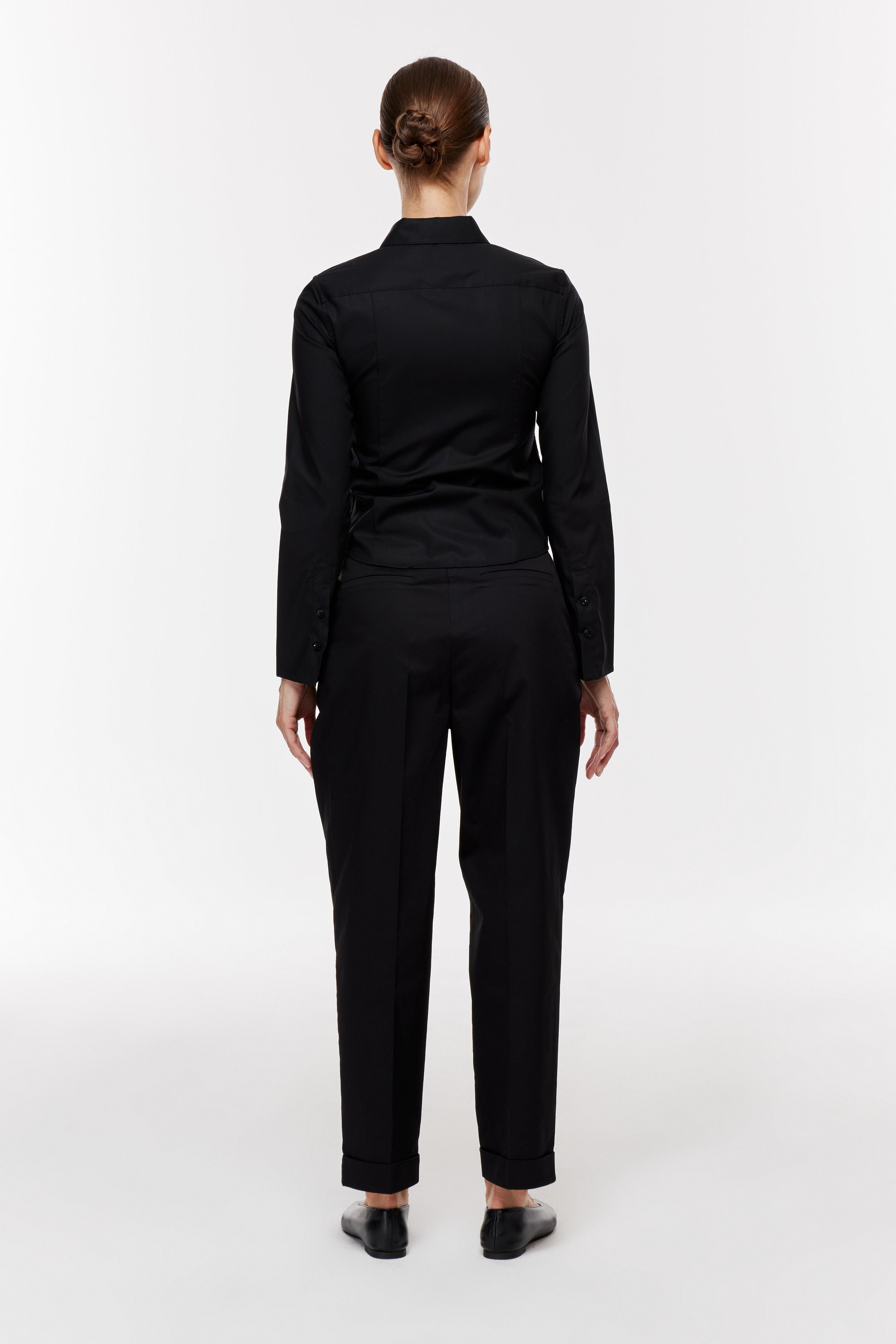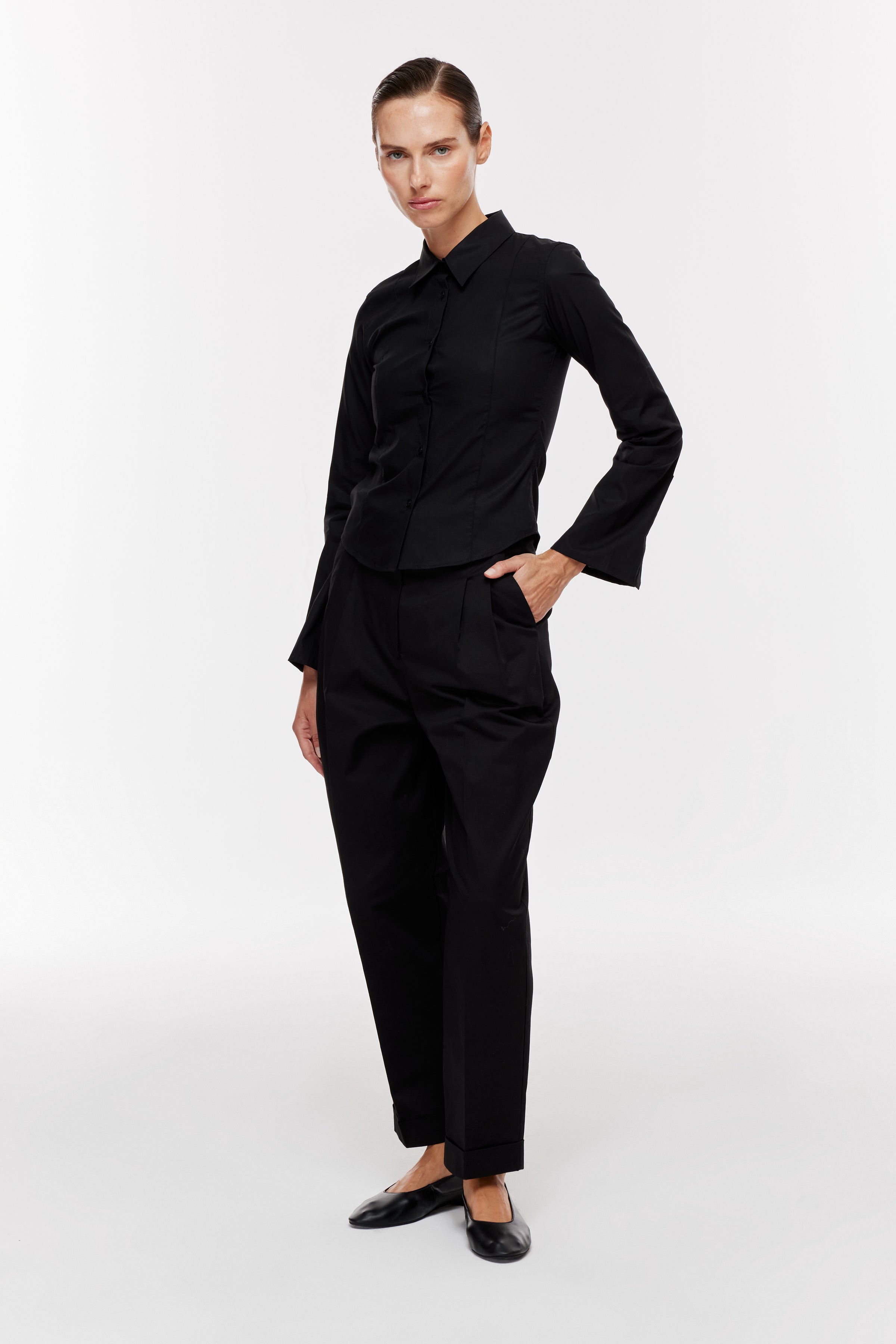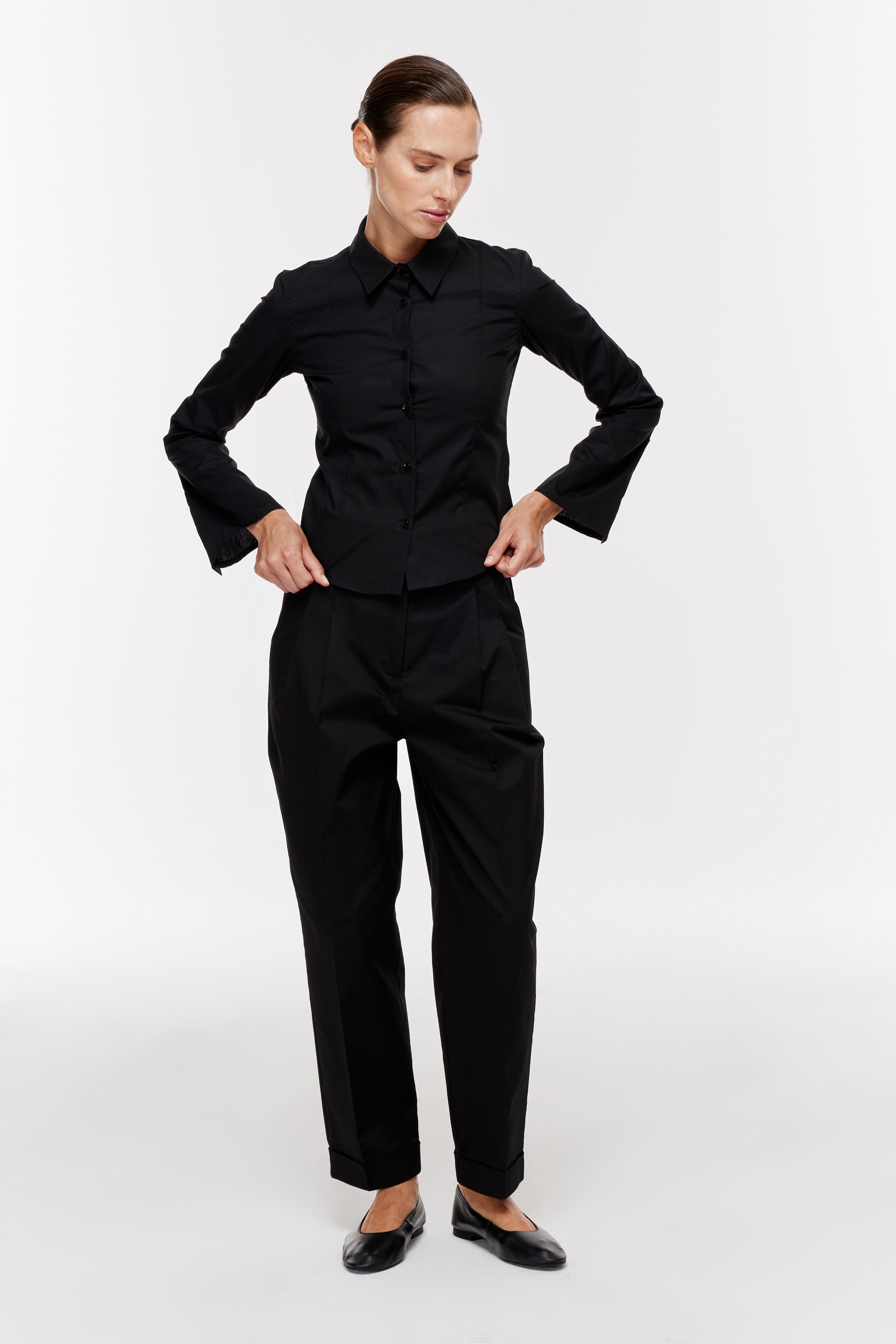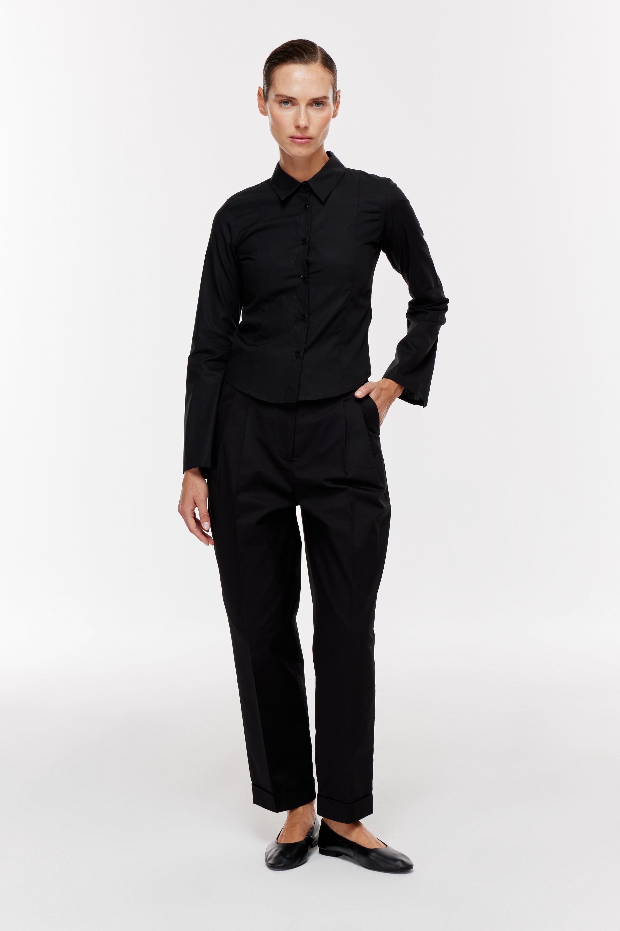 Gömlek yaka, uzun kollu, vücuda oturan gömlek.