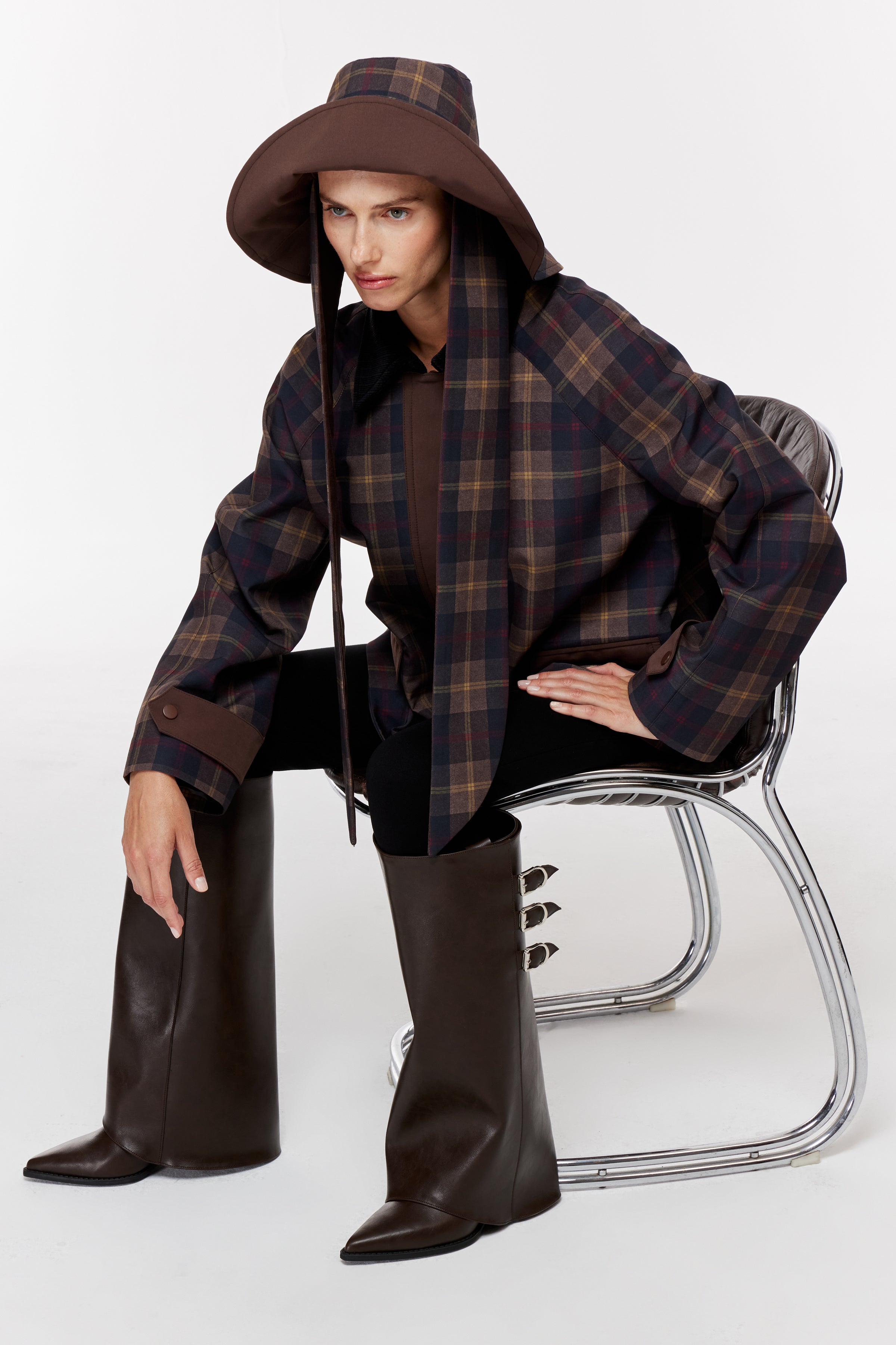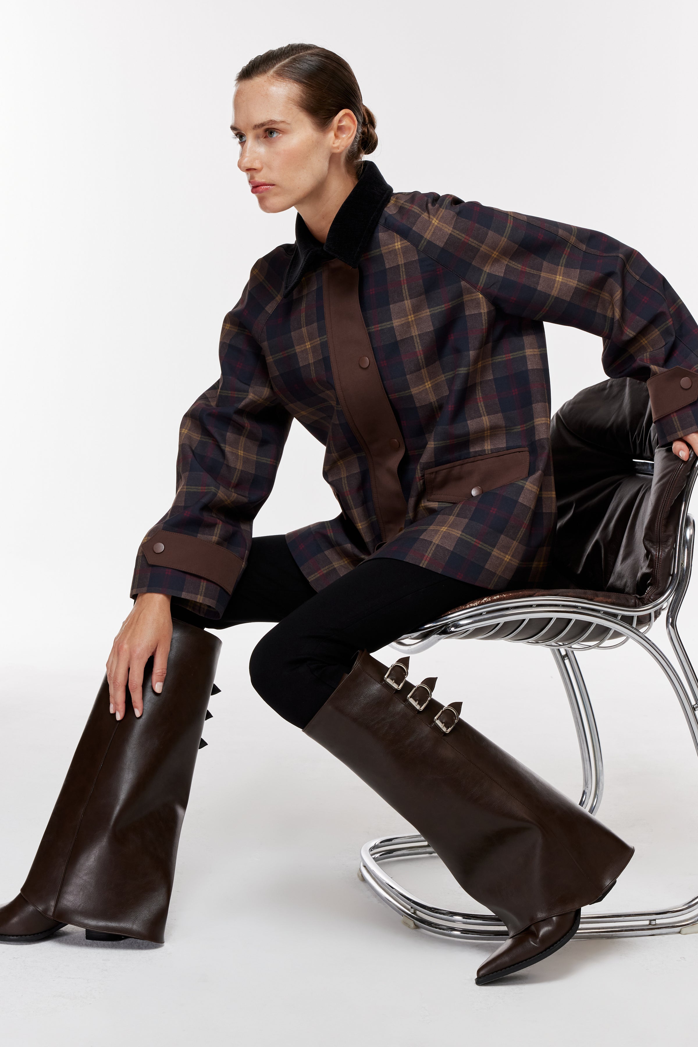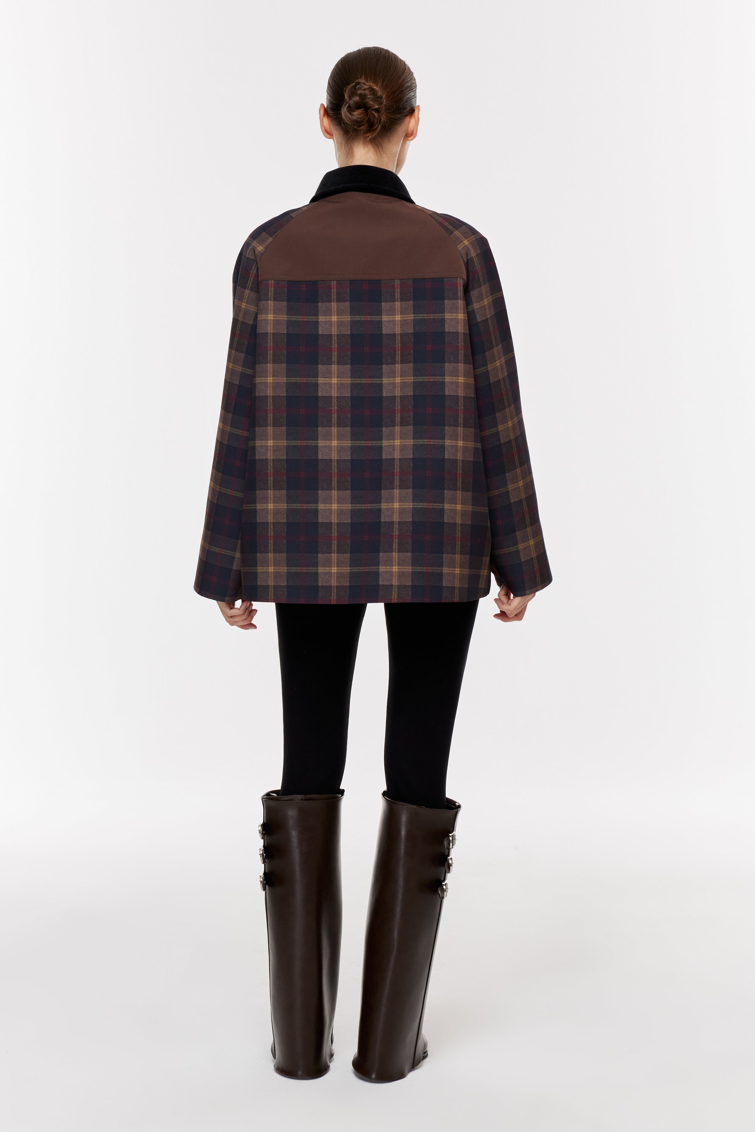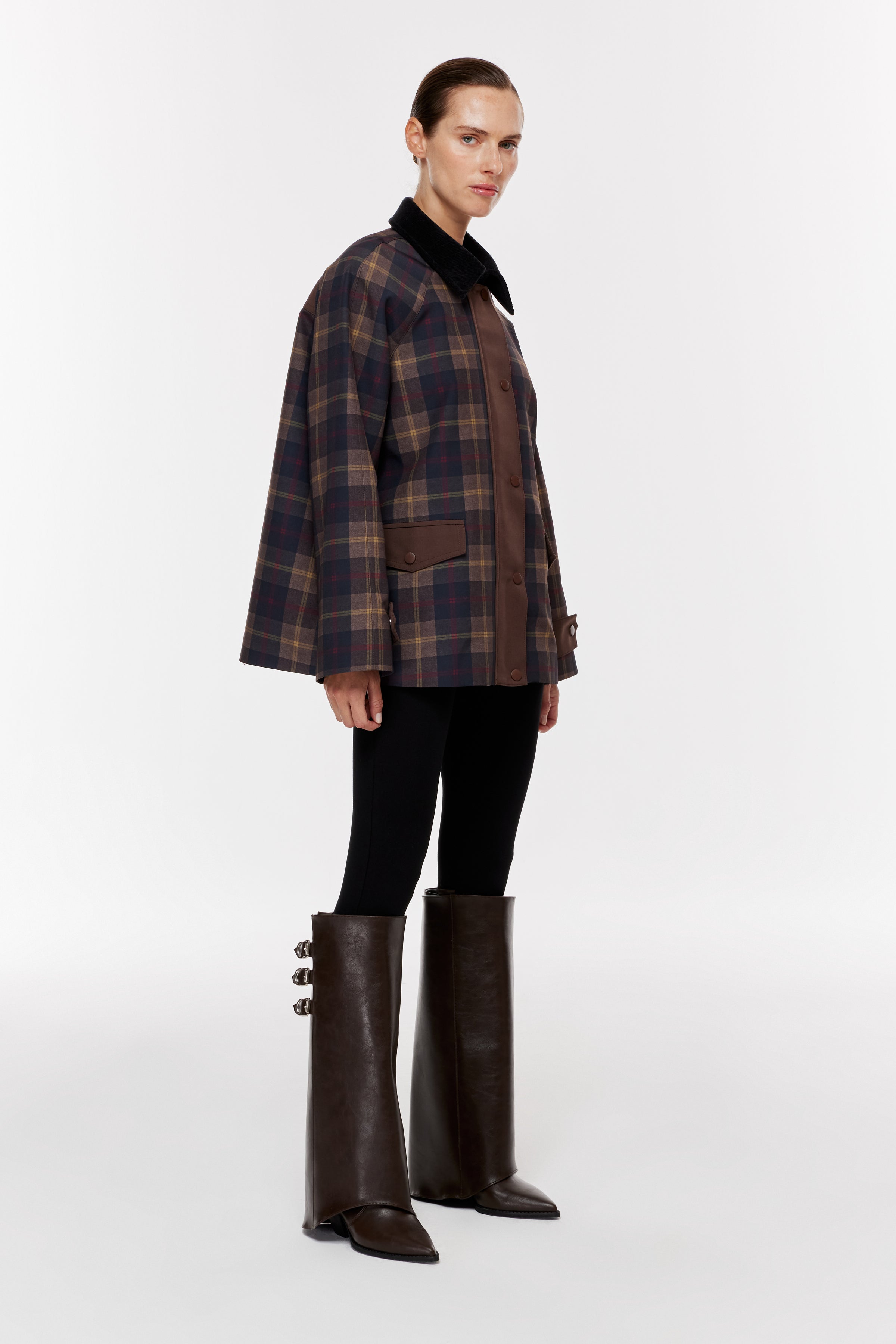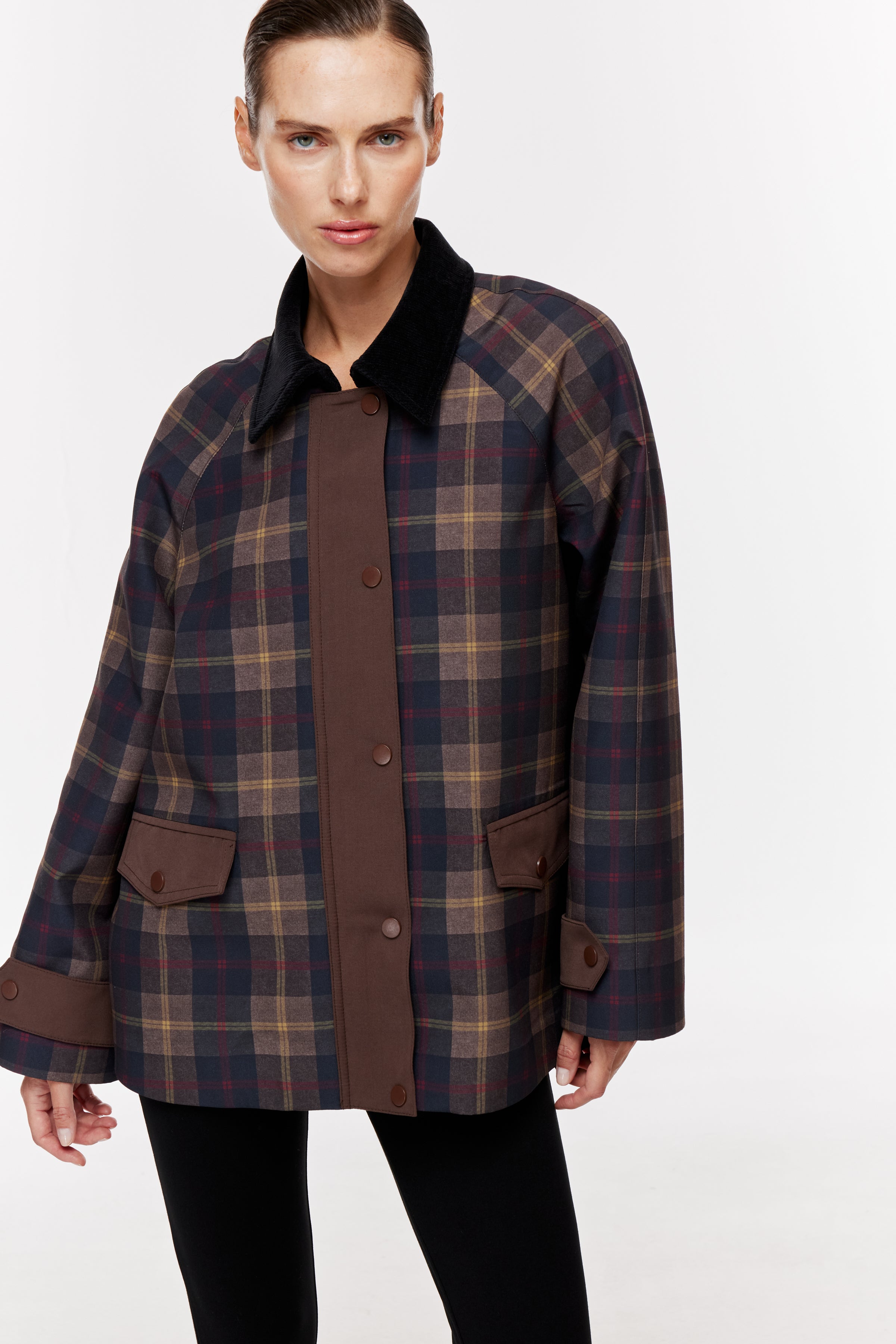 Kadife dokulu kontrast yakalı, uzun kollu parka. Önü kapaklı garni cepli. Ön patı ve sırtı kontrast kumaş detaylı, önden çıtçıt kapamalı.
