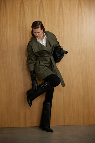 Dik yaka Kemerli Trençkot - Haki