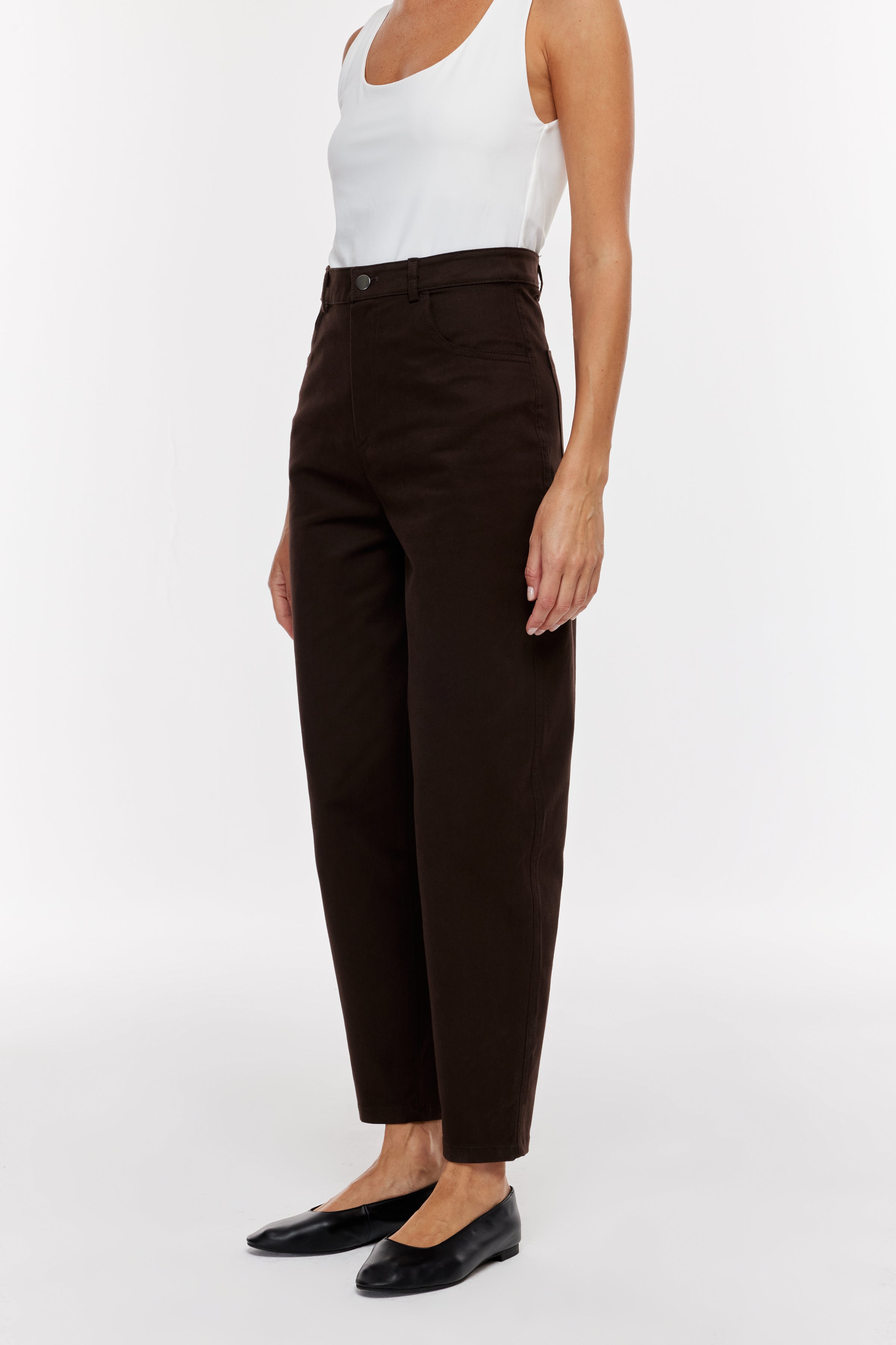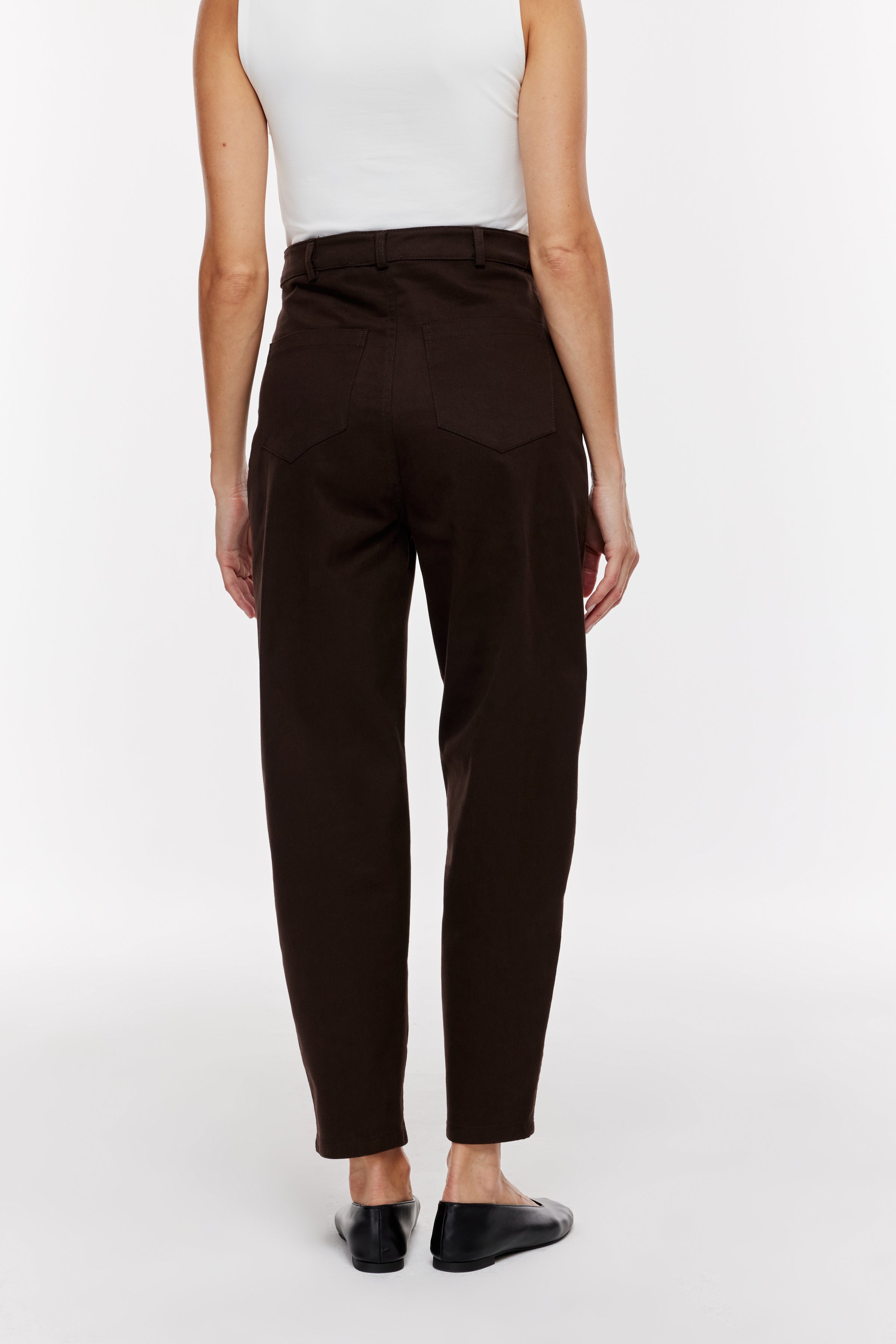 Yüksek bel, rahat, yuvarlak kesim bacak. Önden fermuarlı ve metal düğmeli.