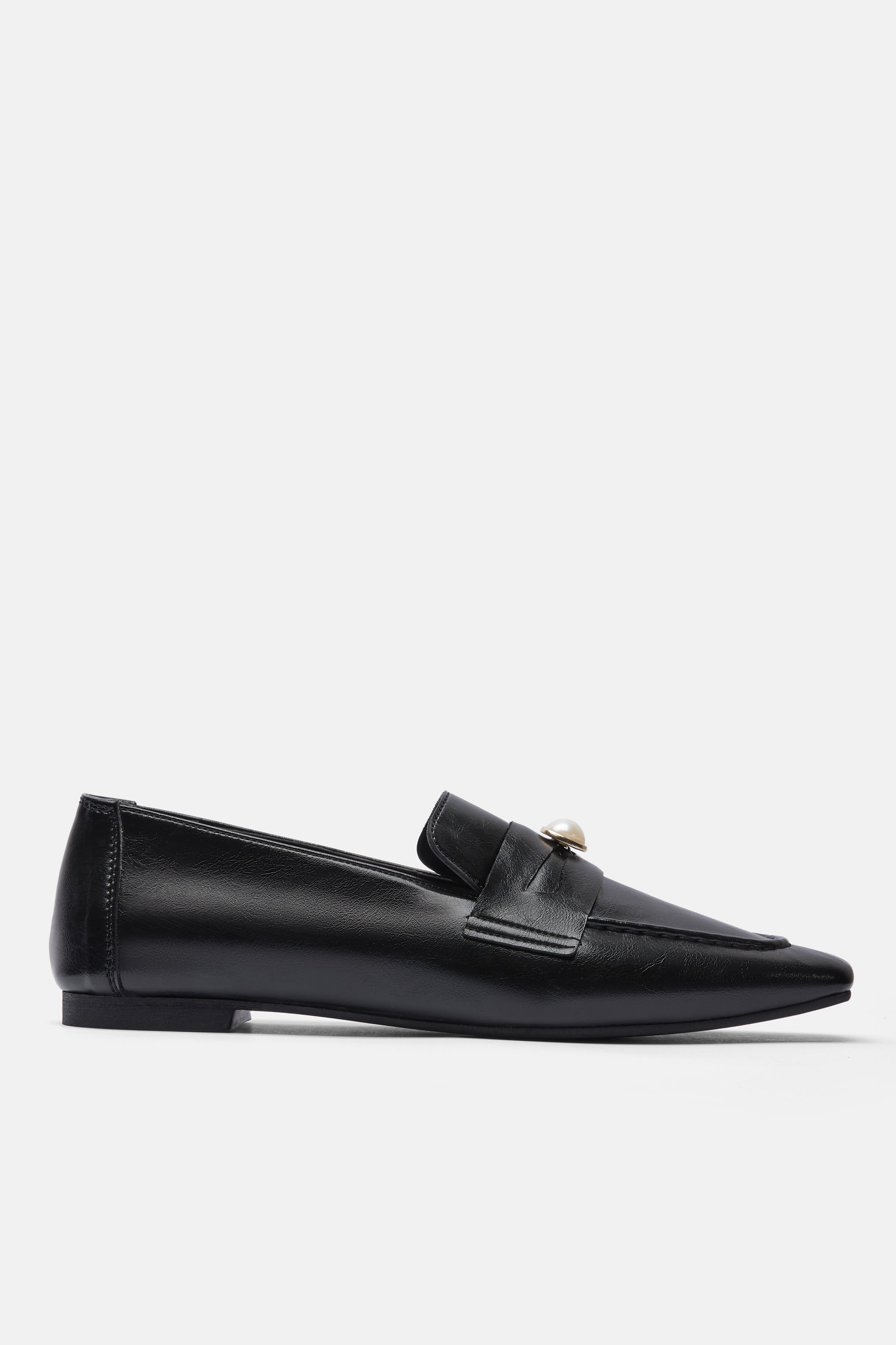 Siyah renkte Kare burunlu vegan deri babet. Bant üzerinde inci detayı bulunur.