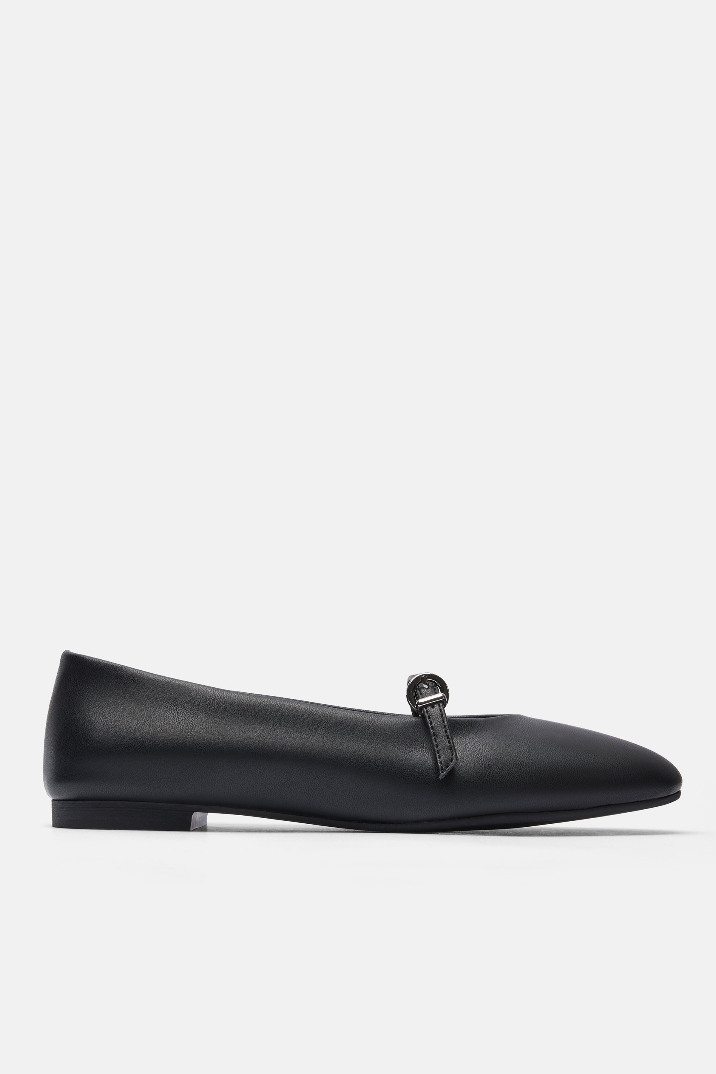 Siyah renkte, yumuşak vegan deri babet. Yuvarlak burunlu. Üst kısmında tokalı bant detayı bulunur. Kaymaz taban özellikli. Topuk: 2cm.
